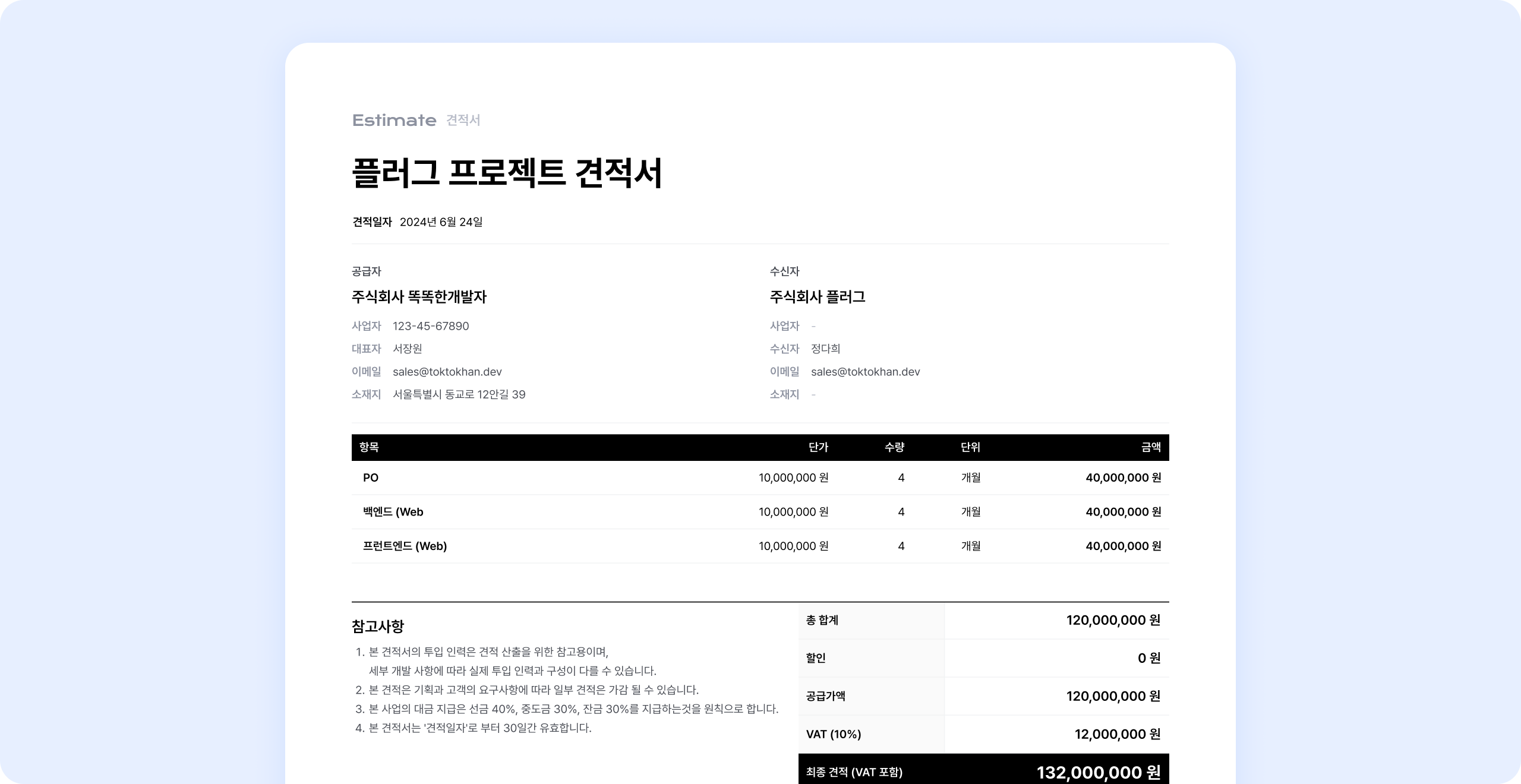 견적서, 고객에겐 첫인상! 브랜딩을 녹여 깔끔하고 빠른 견적서를 세팅해보세요.