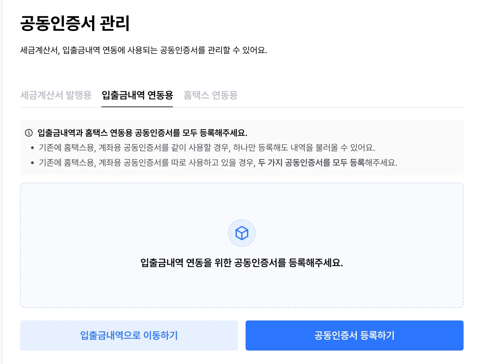 범용 공동인증서를 사용하고 있는 경우에는 홈택스/입출금내역 연동용에 1가지 공동인증서만 등록해도 모두 불러올 수 있어요! 하지만, 두 가지를 공동인증서를 분리하여 사용하고 계시다면, 꼭 두가지 공동인증서 모두 등록했는지 확인해 주세요!