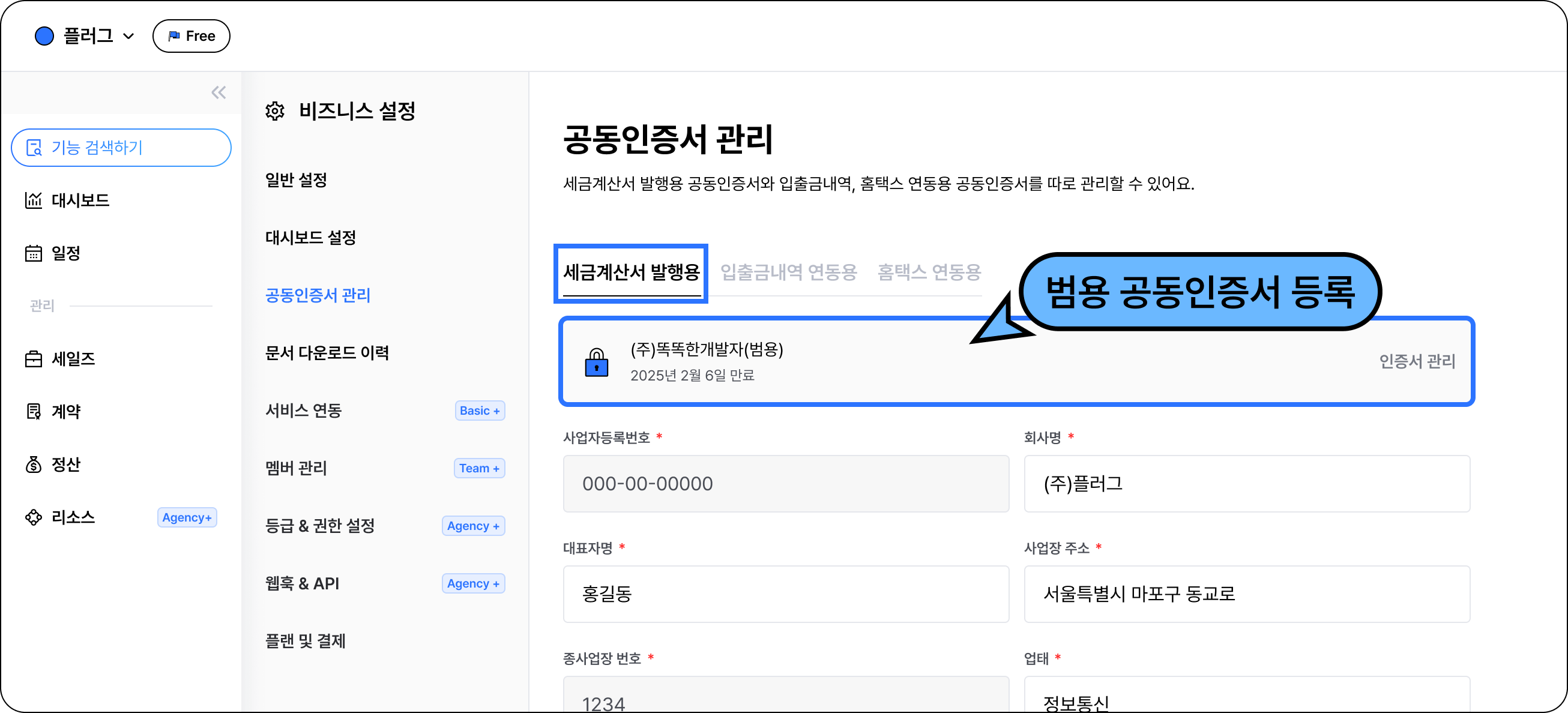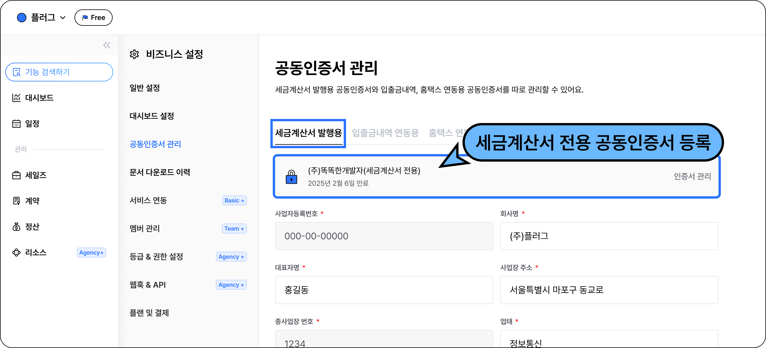 비즈니스 설정>공동인증서 관리>홈택스 연동용페이지로 이동세금계산서 전용 또는 범용 공동인증서를 등록했는지 확인