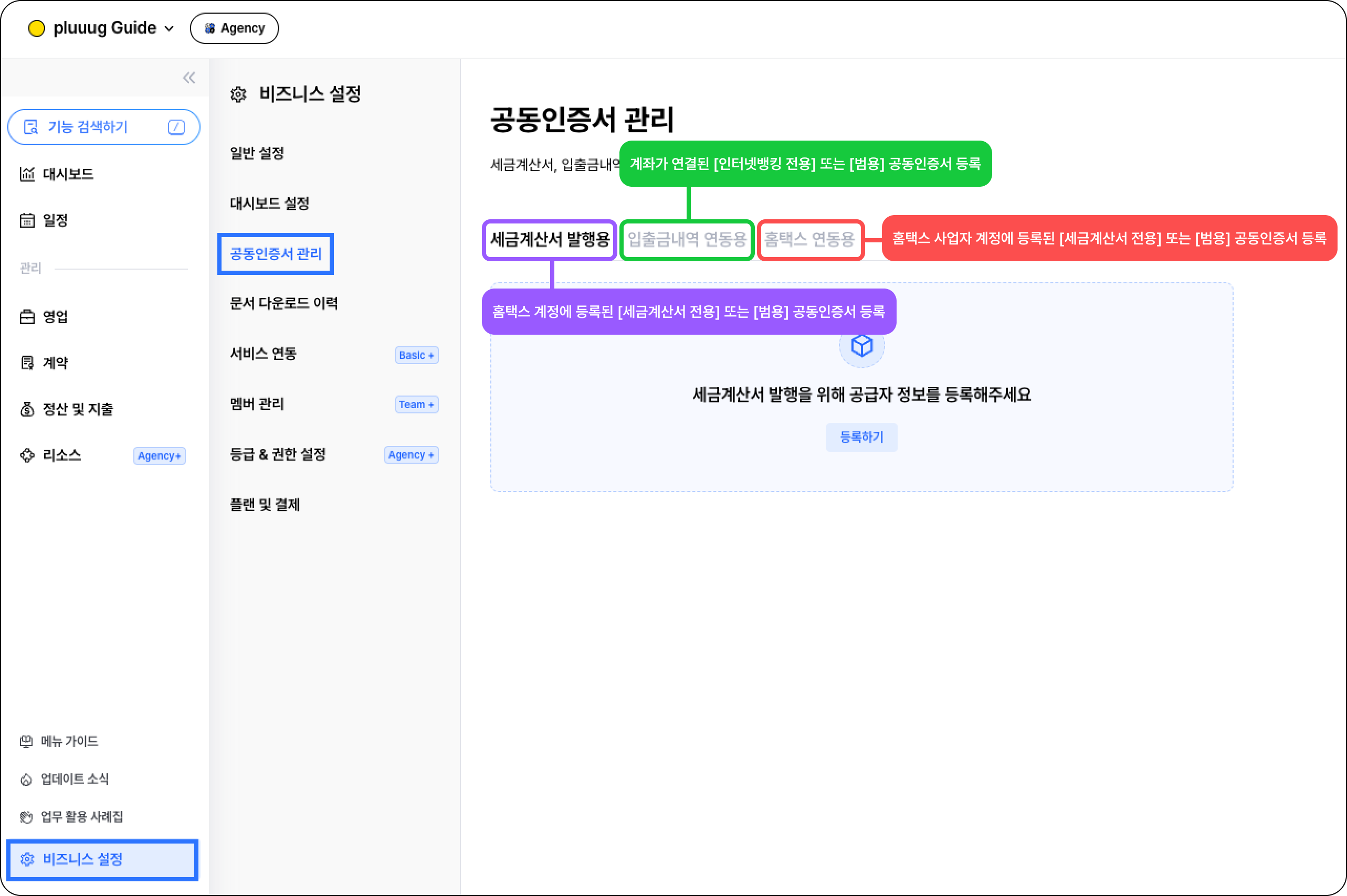 비즈니스 설정 > 공동인증서 관리의 아래 탭에서 각각 1회씩 등록해주세요.