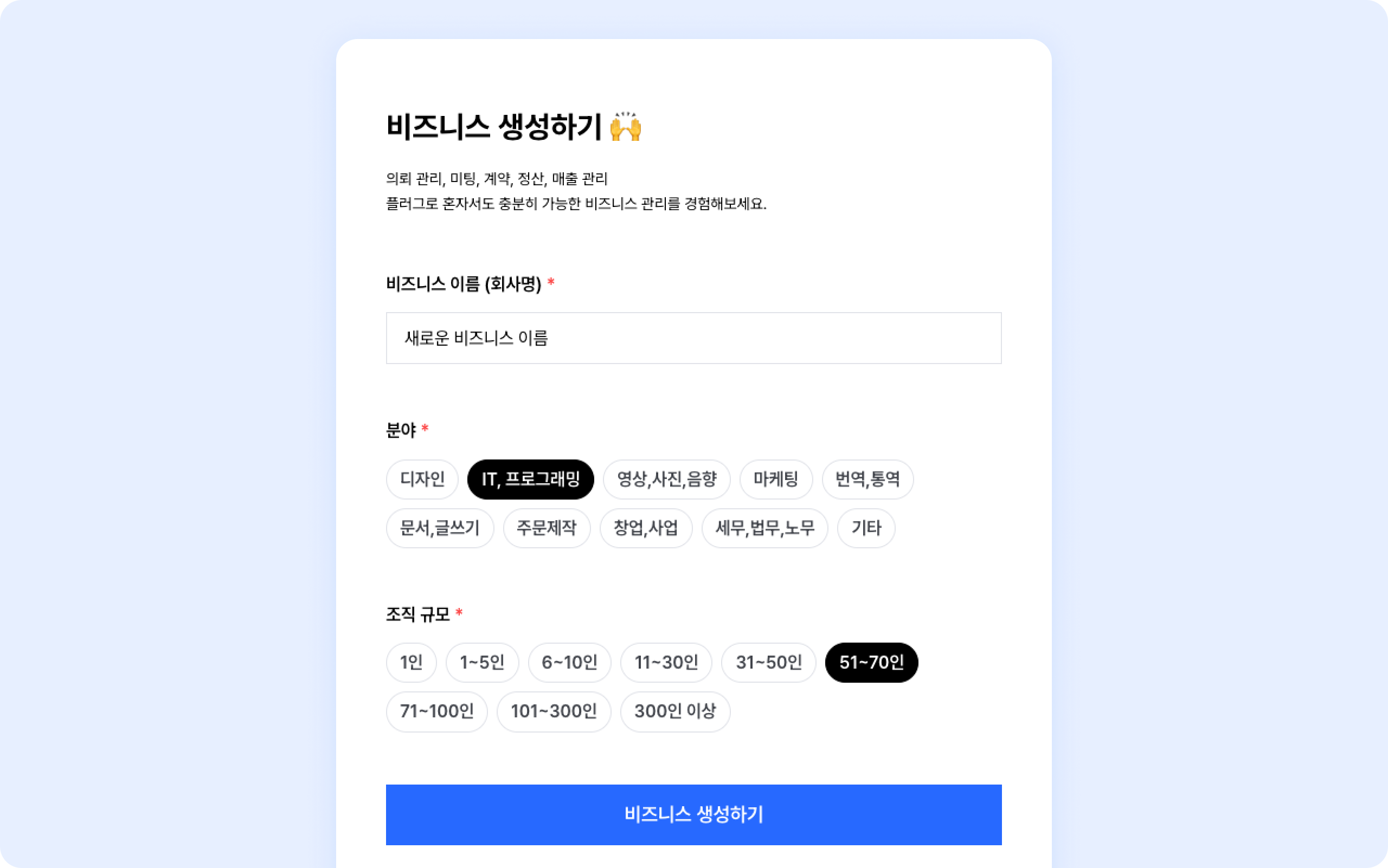 아래의 정보를 모두 입력하고, 비즈니스 생성하기 버튼을 클릭하세요.