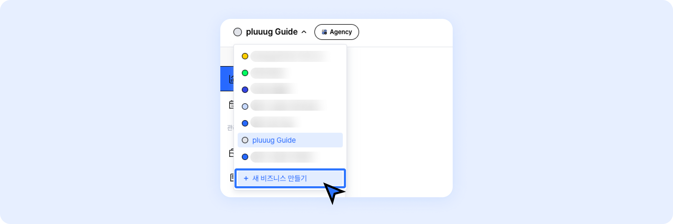 플러그 좌측 상단 비즈니스 메뉴를 클릭하고, +새 비즈니스 만들기 버튼을 클릭하세요.