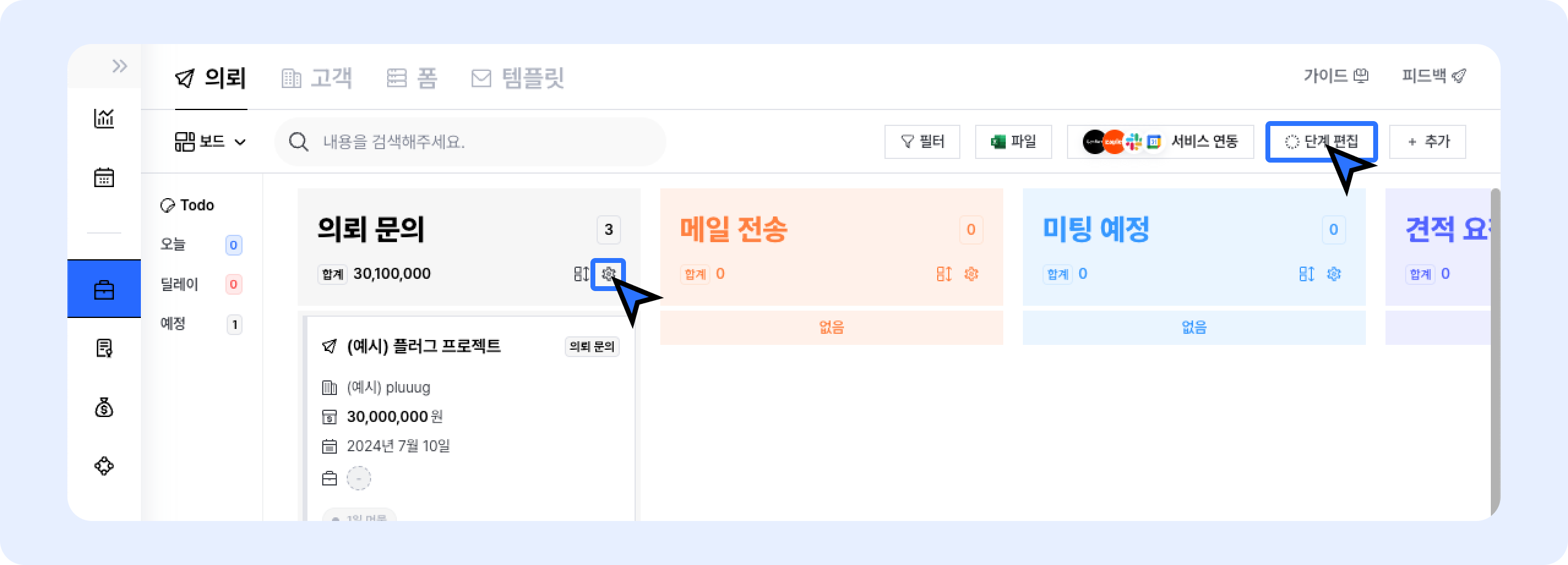 플러그에서 영업 파이프라인을 세팅하면, 영업 업무 흐름을 한눈에 정리하고, 놓치는 영업 누락 건 없이 관리할 수 있어요.