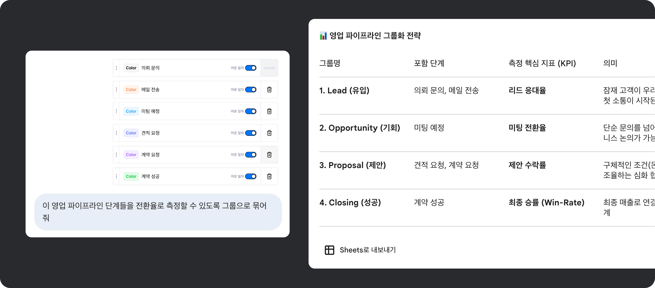 전환 그룹을 처음 설계해보시는 분들이라면 개념을 이해하기 어려울 수 있어요. 현재 플러그에 등록한 영업 단계를 AI (GPT, Gemini) 도구에 전달하고, "이 영업 파이프라인 단계들을 전환율로 측정할 수 있도록 그룹으로 묶어줘" 라고 요청해보세요!