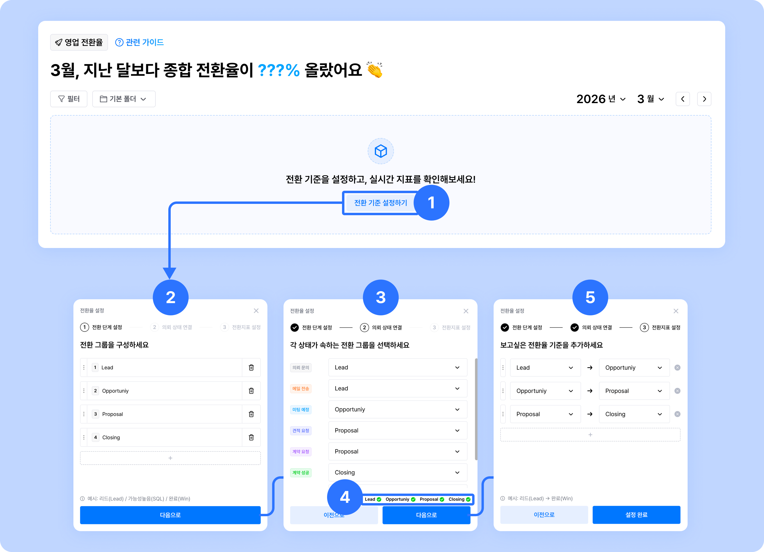 ① 대시보드 > 영업 전환율 > [전환 기준 설정] 버튼을 클릭하세요.