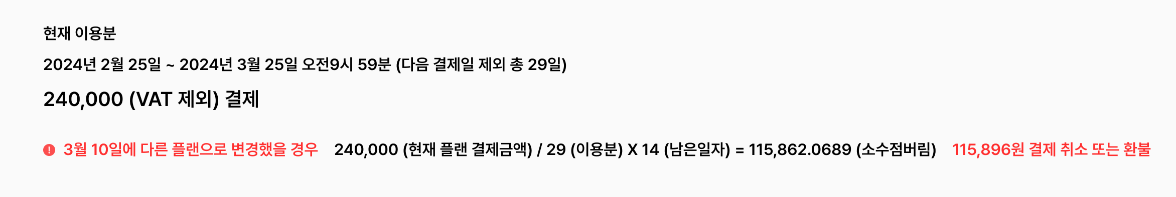 취소금액 = 현재 플랜 결제금액(VAT 제외) / 이용분(다음결제일 제외)의 전체 일수 X 남은 일자