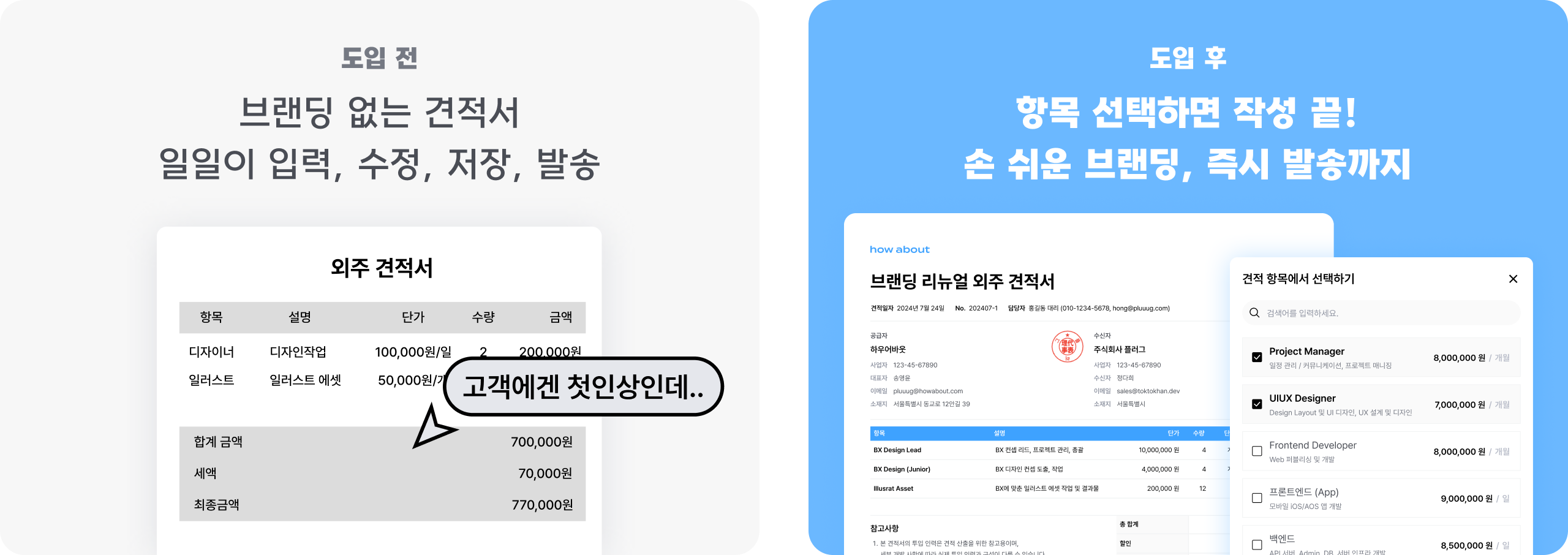 견적서 요청부터 발송까지 단 5분 만에! 브랜딩을 녹인 견적서, 빠른 발송 모두 첫 인상이에요.