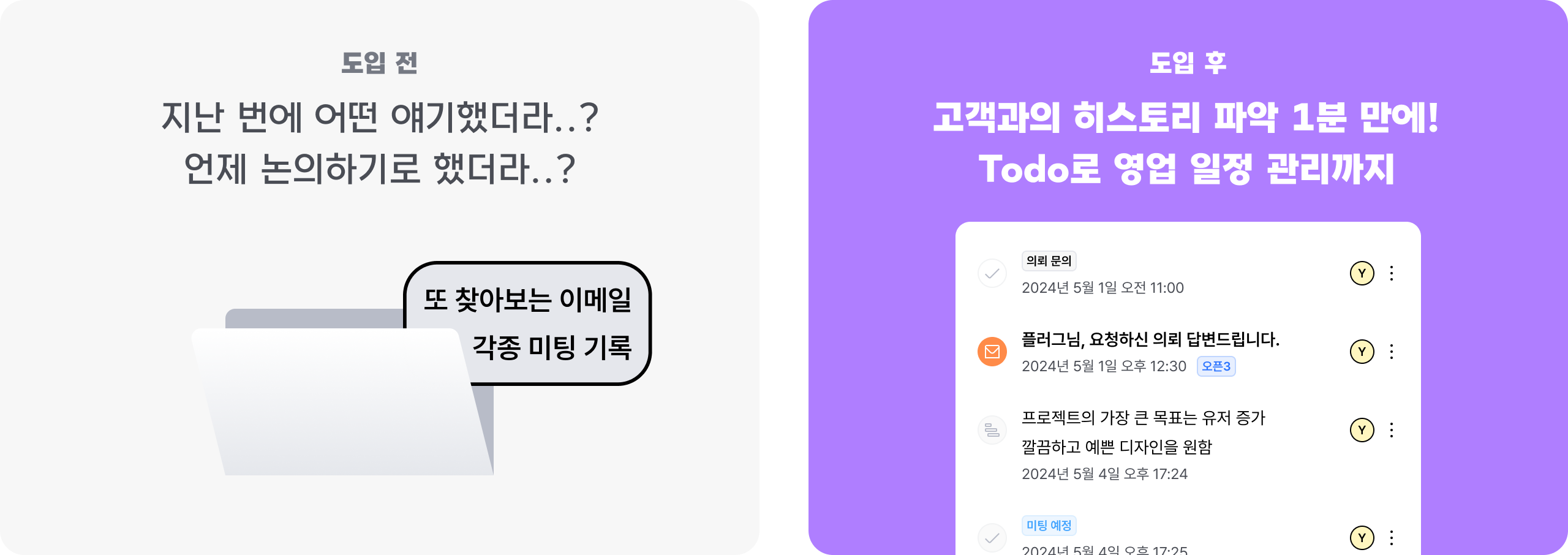 고객과의 지난 히스토리들, 1분 만에 파악하세요! 감동으로 비롯된 관계는 프로젝트 종료까지 따라와요.