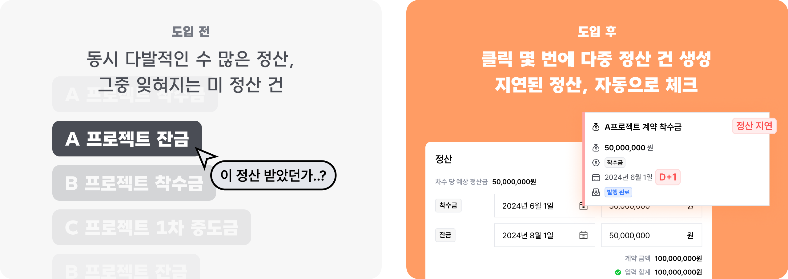 각 정산의 지연 여부가 자동 체크돼요. 모든 정산을 잊지 않고 챙길 수 있어 안정적인 운영이 가능해요.