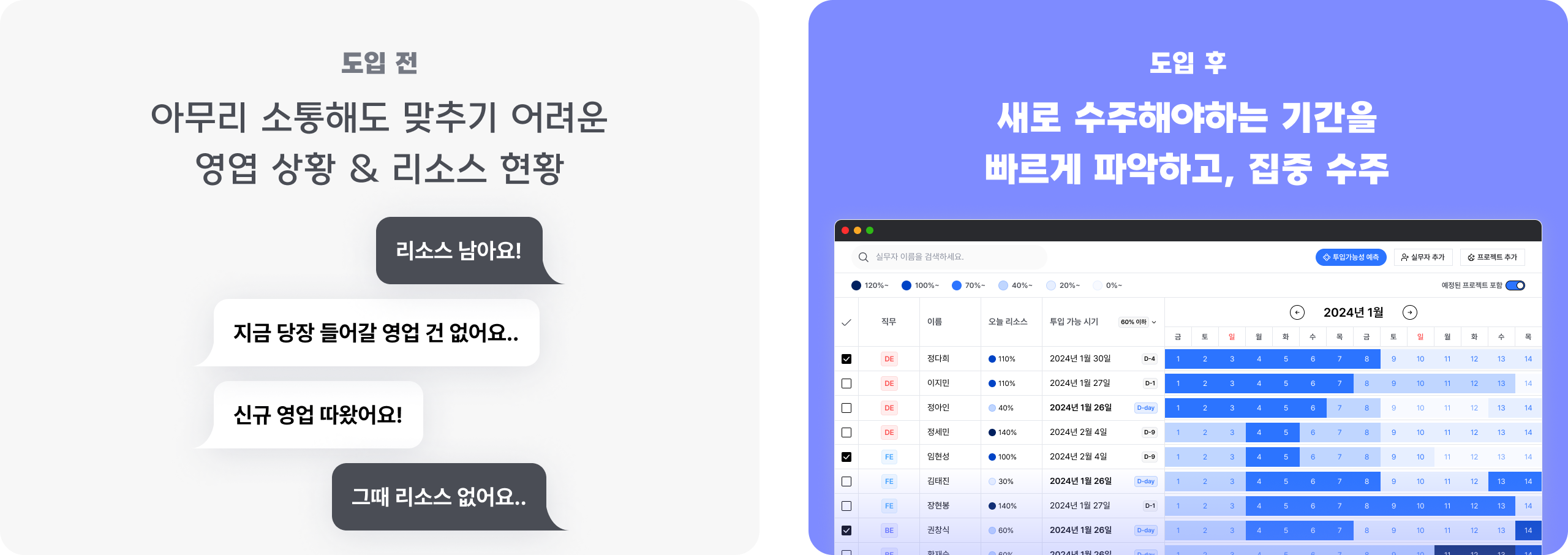 실시간으로 투입현황을 파악해, 새로 수주해야하는 기간을 찾고, 집중 영업할 수 있어요.