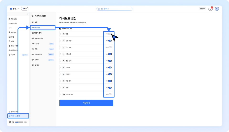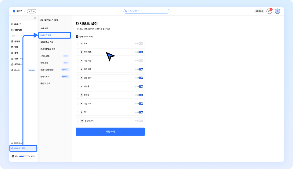 플러그에 가입하면 기본적으로 모든 대시보드가 활성화 되어있어요. 한눈에 현황을 파악하기 위해 꼭 필요한 대시보드만 활성화 해둘 것을 추천해요. 각 대시보드의 의미를 파악하고, 꼭 필요한 대시보드가 어떤 것인지 골라보세요.