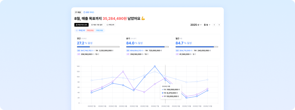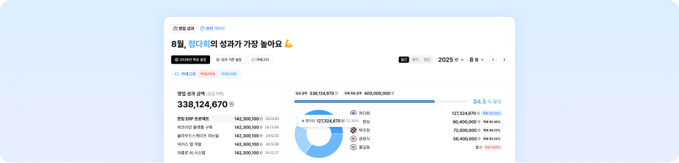 ③ 통합 KPI 목표 관리: 영업부터 최종 매출 실현까지의 과정을 통합 지표로 관리하여, 목표 달성을 위한 구체적인 전략을 찾을 수 있어요.