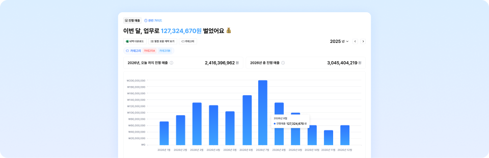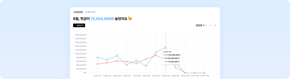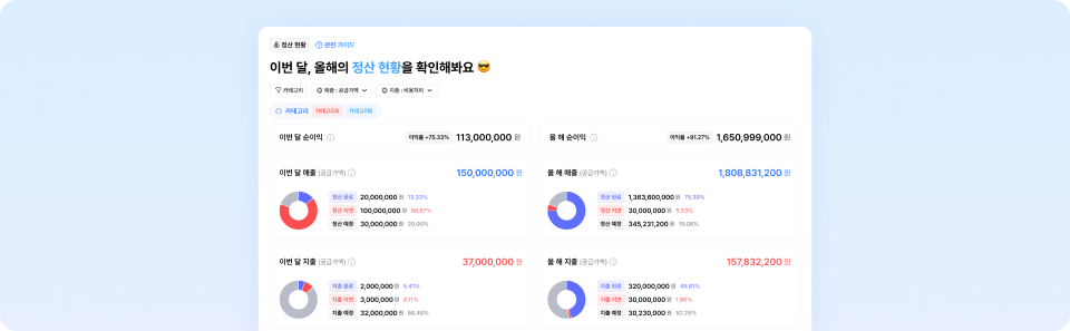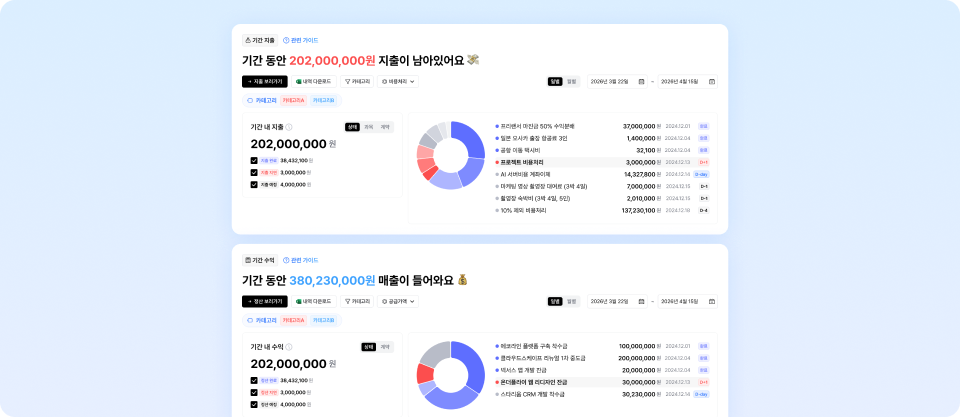 특정 기간 내에 발생할 정산 수익과 지출 금액을 확인할 수 있는 대시보드예요. 안정적인 현금의 흐름을 관리하기 위해 필수로 사용하는 지표로, 모든 B2B 비즈니스에 추천해요.