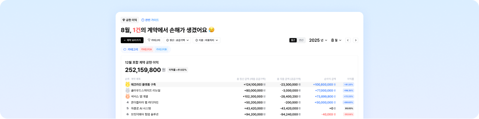 계약의 '총 정산 금액'과 '총 지출 금액'을 기반으로 손익을 파악할 수 있어요. 각 월 안에서 포함된 모든 계약의 손익 현황을 한눈에 파악할 수 있어요. 계약 내에서 재하청, 원재료비, 마케팅비 등의 지출이 자주 발생해 계약 별 순이익을 관리해야하는 회사에 추천해요.