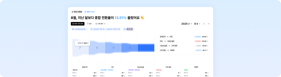 영업의 주요 단계를 나누고, 각 단계별 전환율을 확인할 수 있는 지표예요. 지난 달 대비 얼마나 전환율이 올랐는지 실시간으로 파악할 수 있어요. 영업 프로세스 개선 목표가 있는 조직에 추천해요.