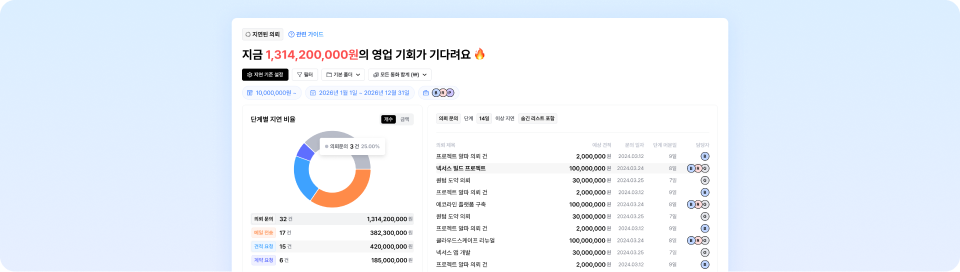 각 영업 단계(상태) 별로 지연된 기준을 정하고, 해당 기준을 넘긴 지연된 의뢰 리스트들을 파악할 수 있는 대시보드예요. 소중한 영업 건이 어느순간 방치되고 잊혀져 영업 기회가 사라지고 있다면, 지연된 의뢰 대시보드를 활용해보세요.