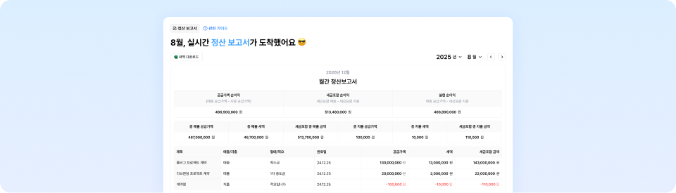 각 월별로 실제 '처리 완료'된 정산과 지출 건만을 모아서 볼 수 있는 보고서예요. 기간 수익, 지출, 정산 현황은 [완료]되지 않은 지연된, 예정된 건들도 모두 확인할 수 있지만, 이 보고서는 실제 금액이 오고간 내역만 집계 되어있어 월 마감 시 용이해요.