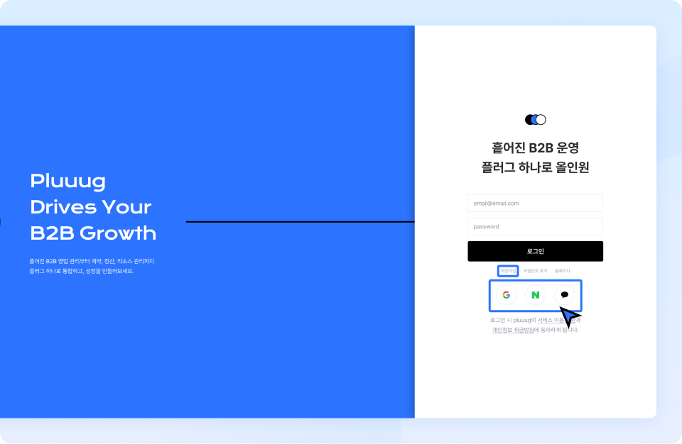 ② 로그인 페이지로 이동해 [각 SNS 로그인 아이콘] 또는 [회원가입] 버튼을 클릭하세요.