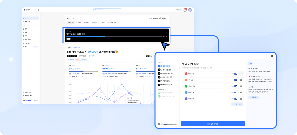 CRM, ERP, 수많은 엑셀 파일, 홈택스, 은행 사이트는 이제 안녕! 이제 다른 툴을 번거롭게 오갈 필요 없이 영업부터 정산까지, 플러그 하나로 끝내보세요.