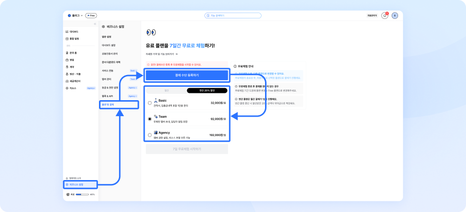 ① 비즈니스 설정 > 플랜 및 결제 메뉴로 이동하세요.
