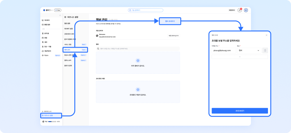플러그는 각 비즈니스에 여러 계정(멤버)을 초대해 사용할 수 있어요.