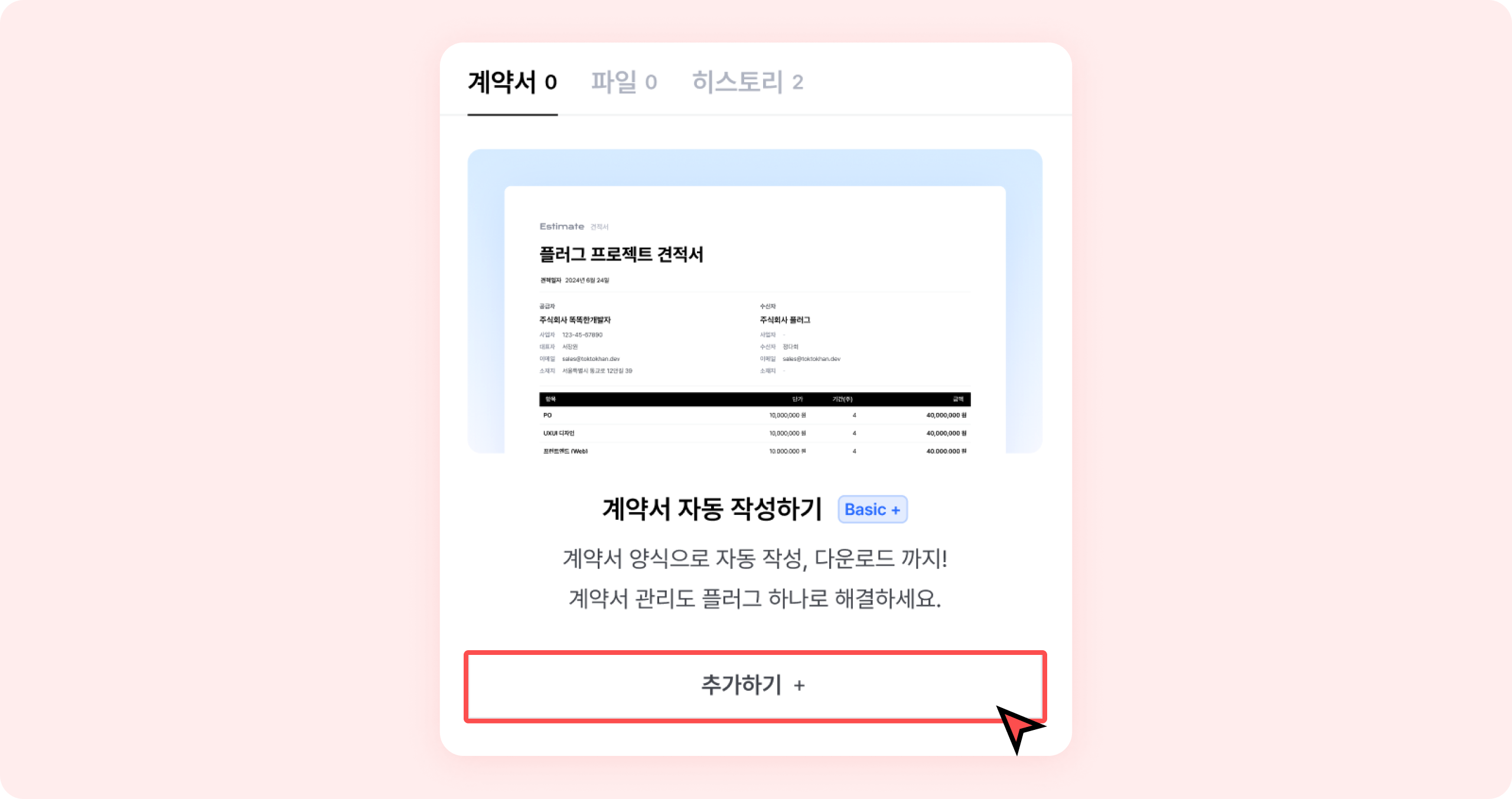 자동 계약서 작성 기능은 Basic 플랜부터 무제한으로 이용할 수 있어요.