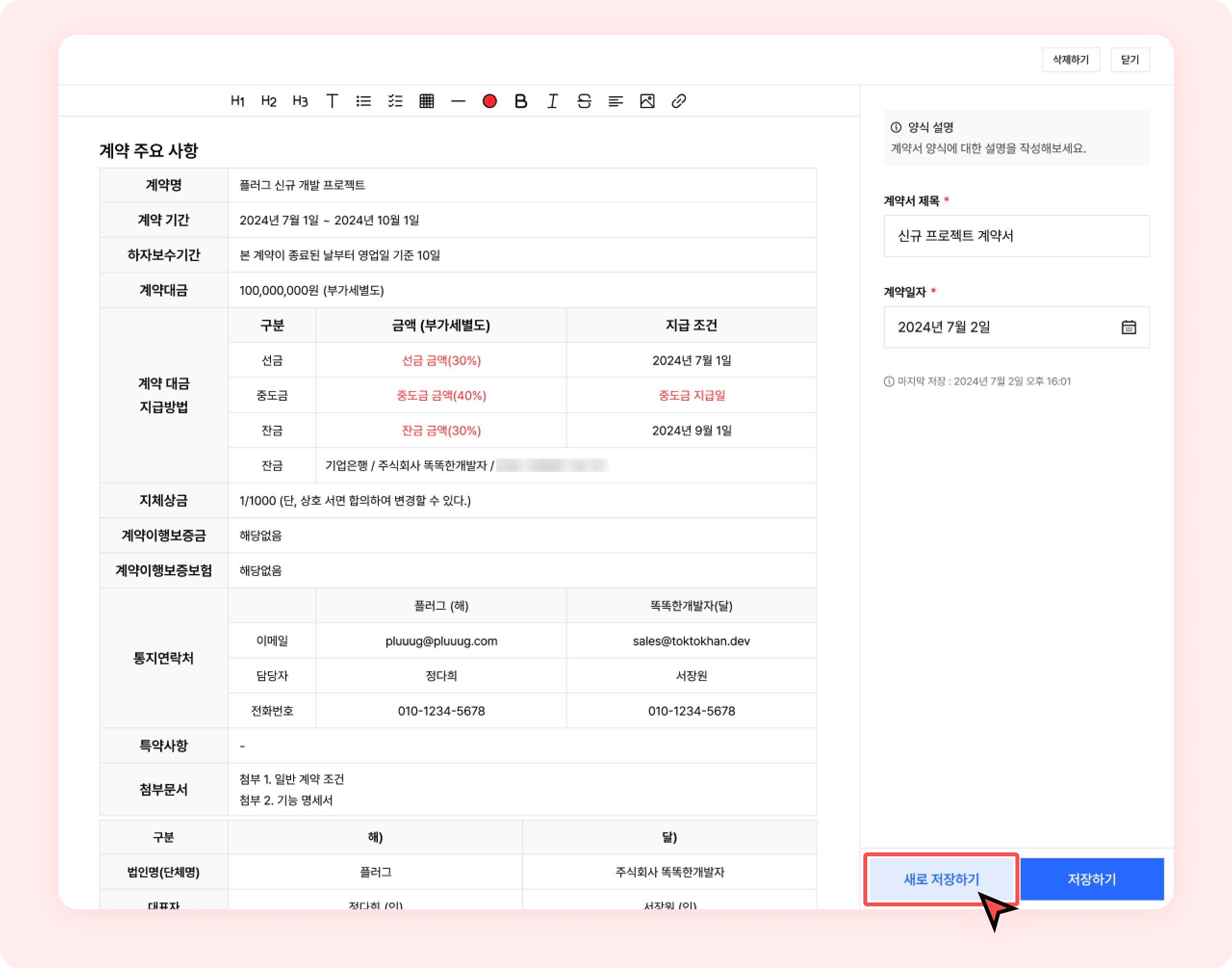 현재 작성중인 계약서를 새로운 버전으로 저장하고 싶은 경우, 우측 하단 새로 저장하기 버튼을 클릭하세요.