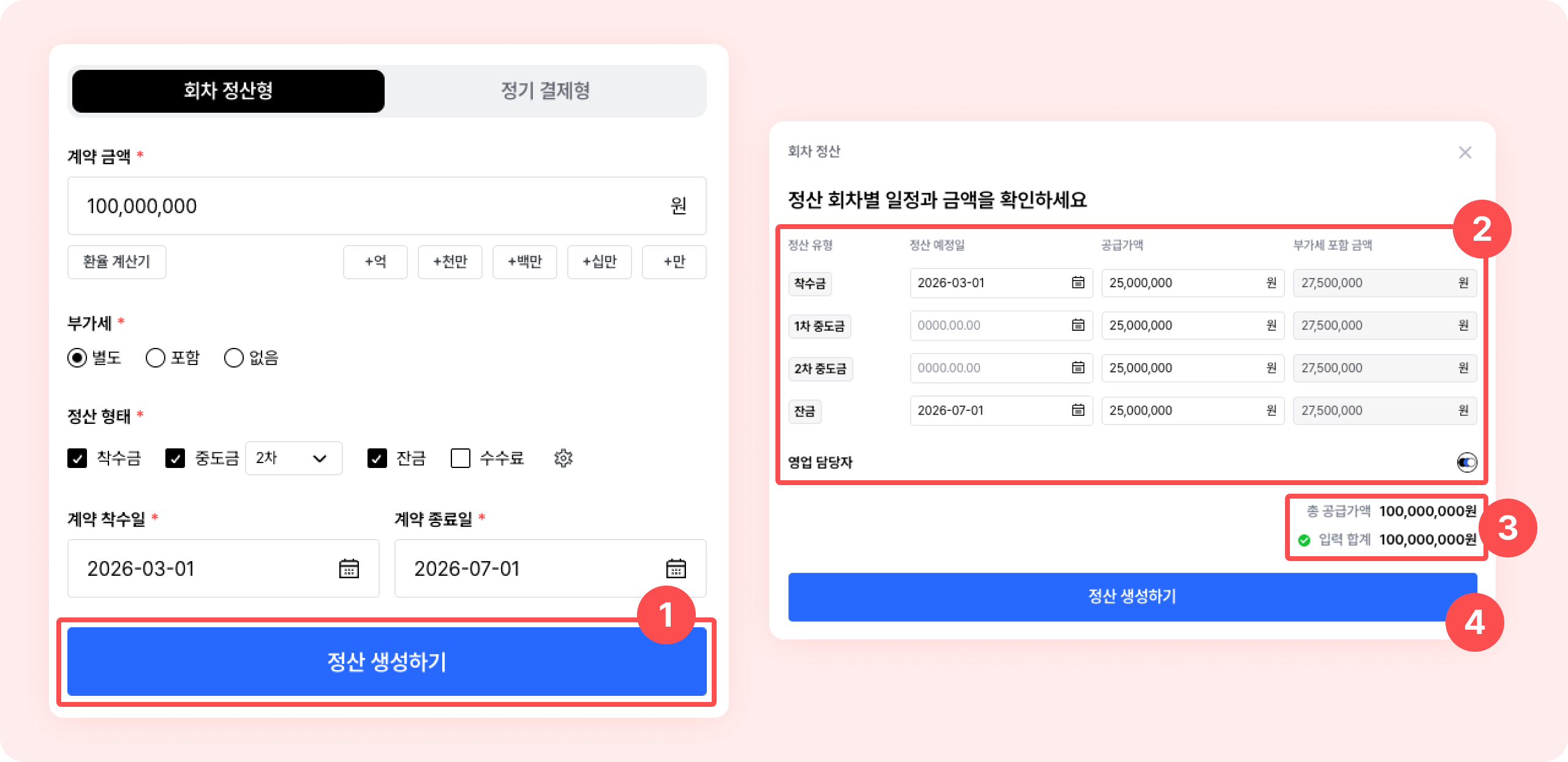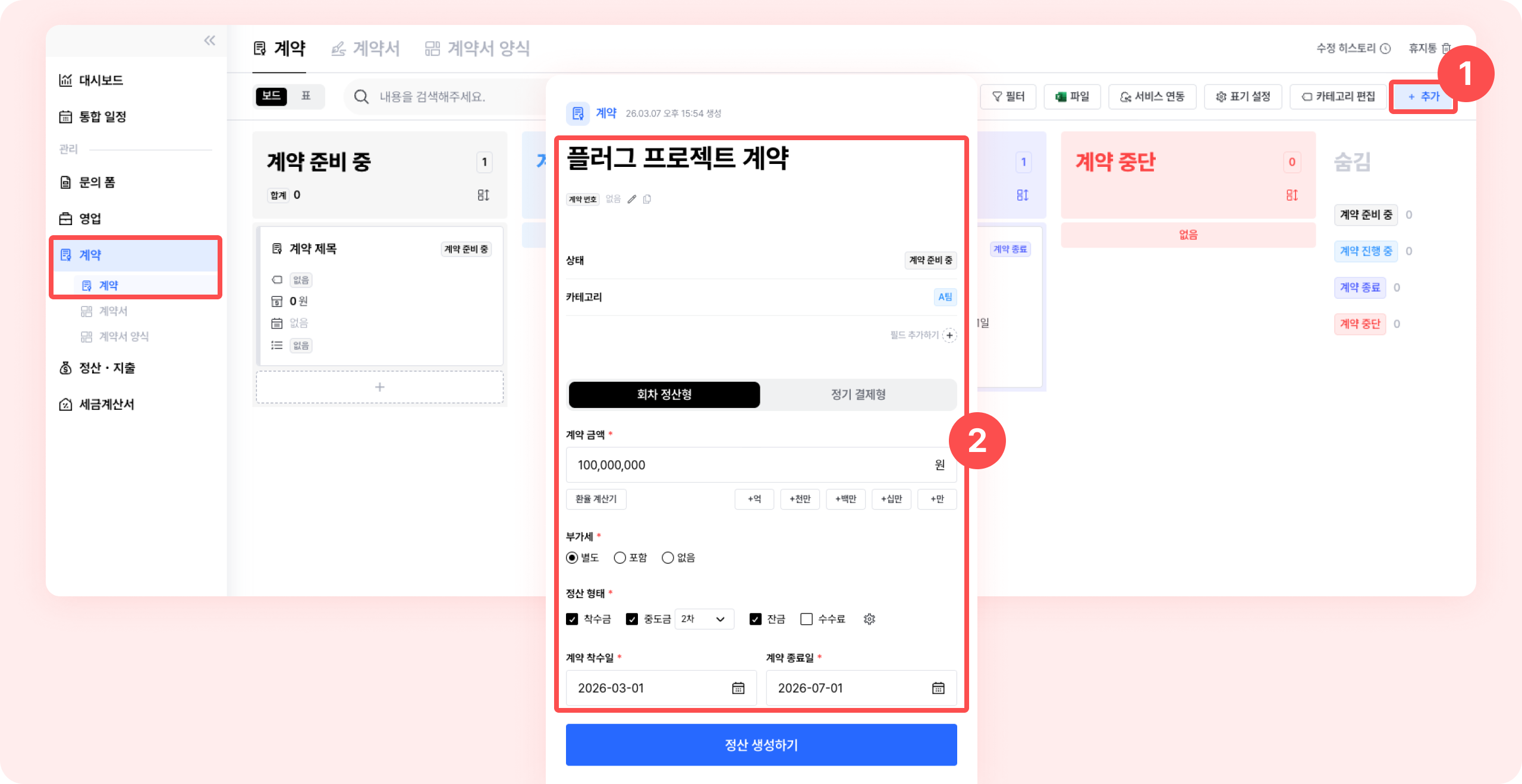 ① 계약 상세페이지 > 좌측 하단에서 > 계약 금액, 부가세, 정산 형태, 착수일, 종료일을 입력하고, [정산 생성하기] 버튼을 클릭하세요.