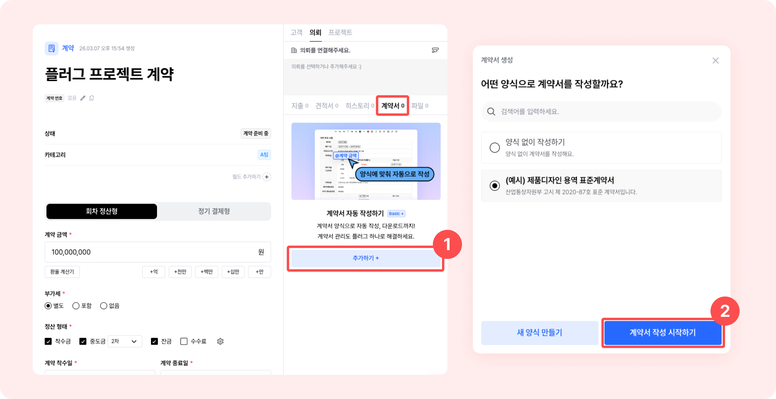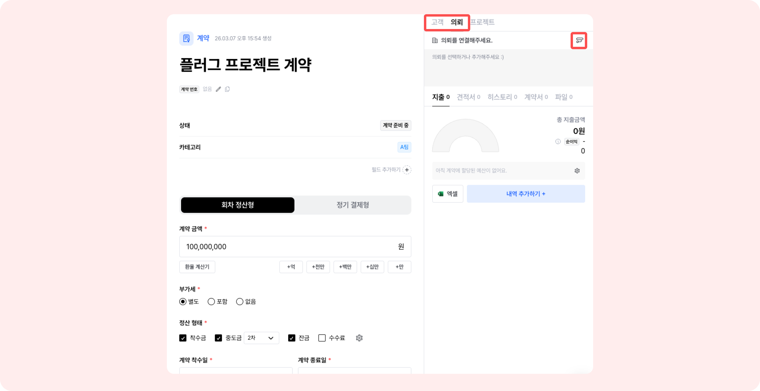 ③ 계약의 금액, 부가세, 정산 형태, 착수일, 종료일 정보를 좌측 개요 부분에 입력하세요.
