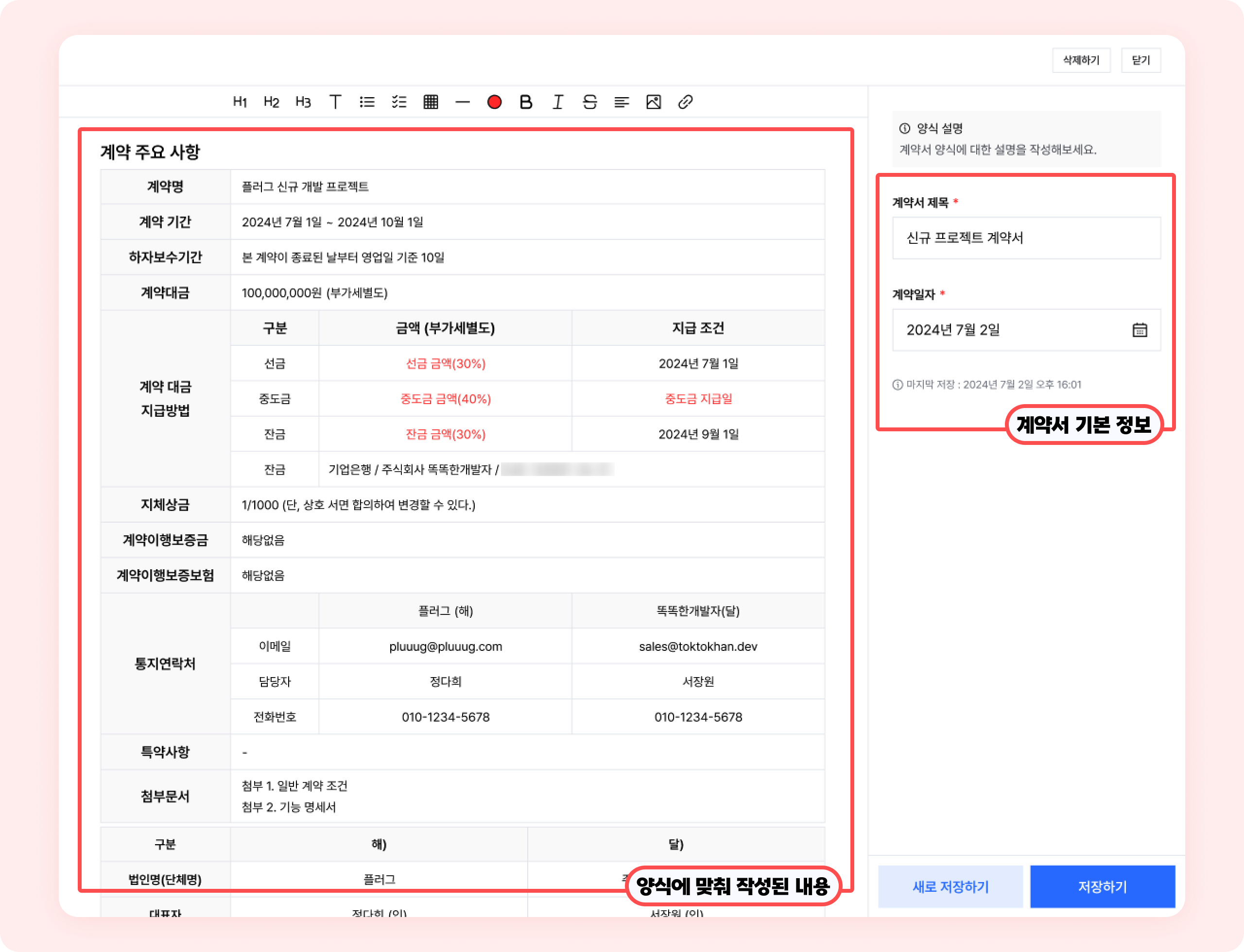 ③ 자동으로 작성된 계약서 내용을 편집하고, [저장하기] 버튼을 클릭하세요.