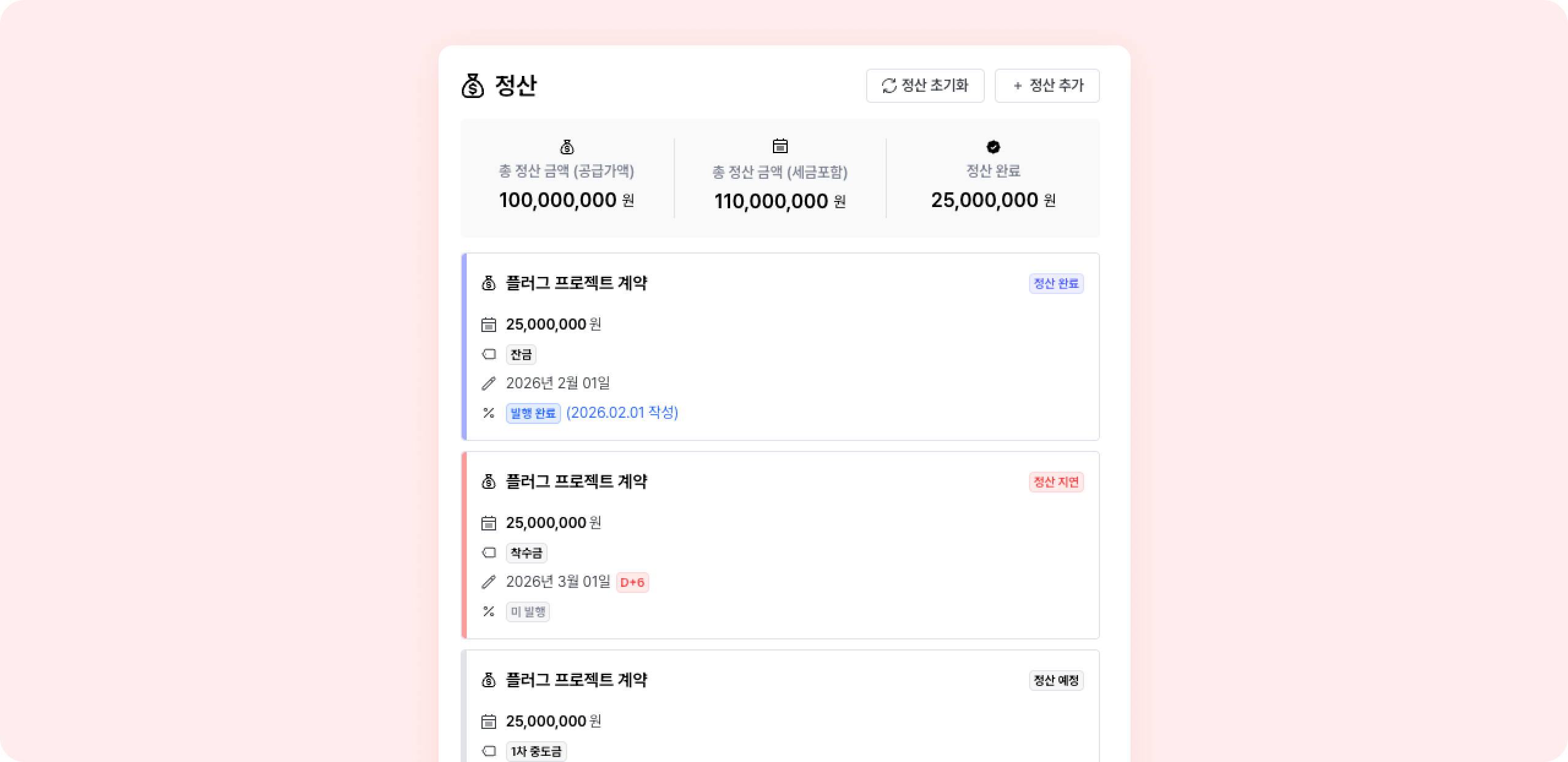 하나의 계약 안에 여러 번으로 나누어진 정산 현황을 빠르게 확인할 수 있어요.