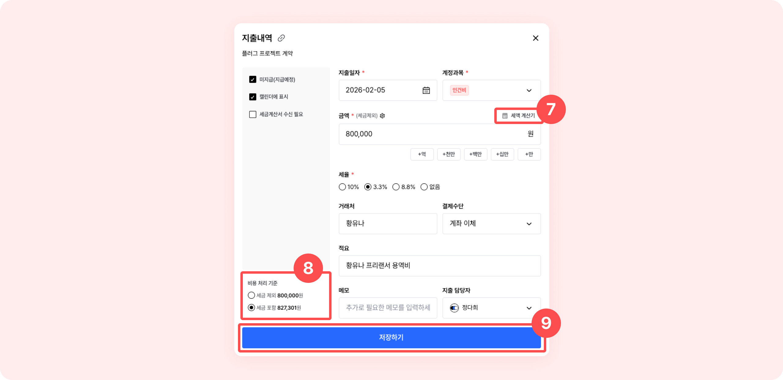 ⑧ 입력과 반대 기준으로 비용 처리가 필요한 경우, 좌측 하단 [비용 처리 기준]을 변경하세요.
