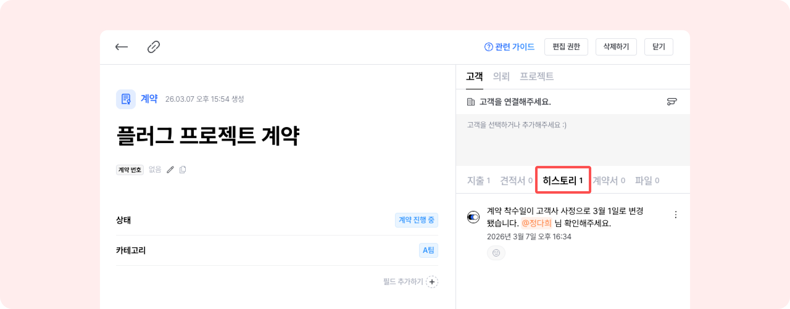 계약 진행 도중 일정 변동 등이 발생할 경우, 히스토리로 메모 기록을 남길 수 있어요.