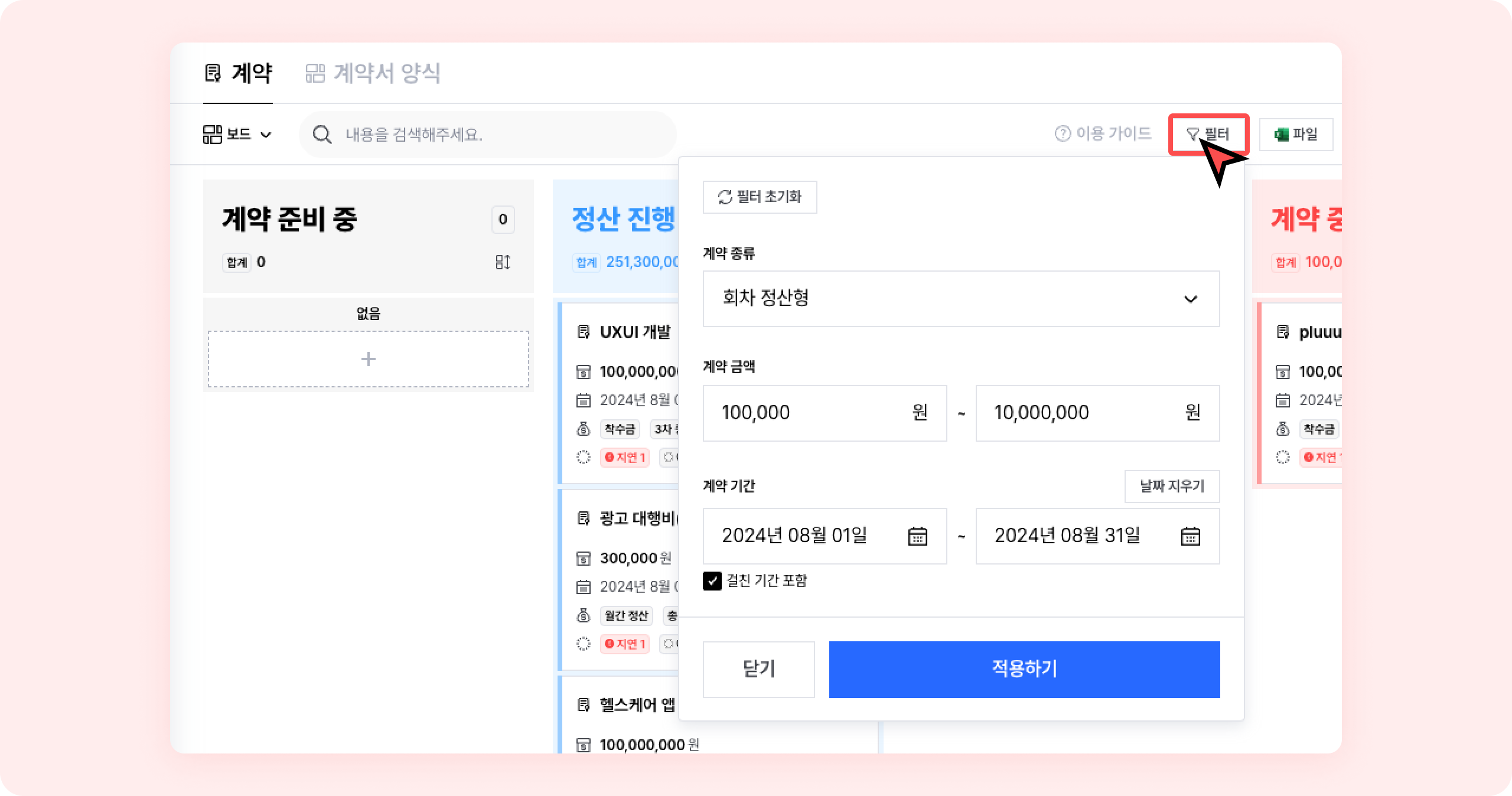 계약 기간 : 계약 기간의 구간을 설정해 포함되는 계약을 필터링 할 수 있어요.
