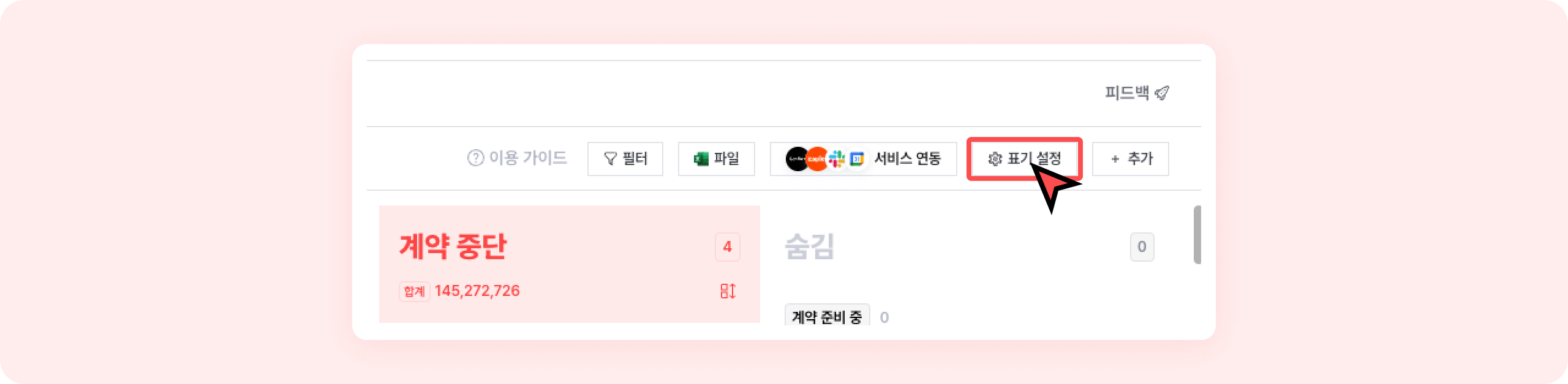 계약 보드 뷰에서 리스트에 표기할 내용을 설정할 수 있어요.