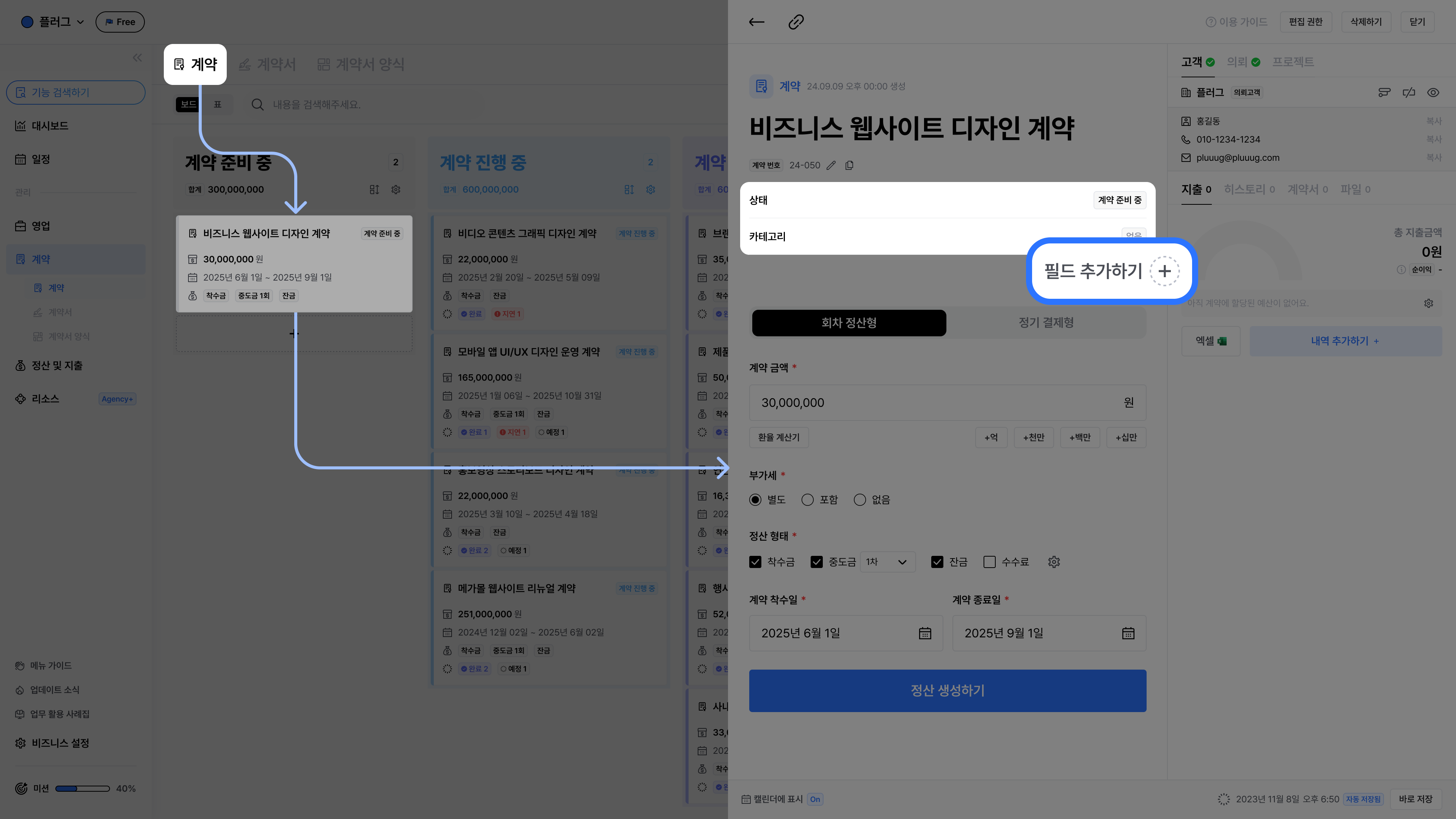 계약 페이지에서필드 추가하기+버튼을 클릭하세요.데이터 타입과필드 이름을 입력한 후,추가 완료를 클릭하세요.