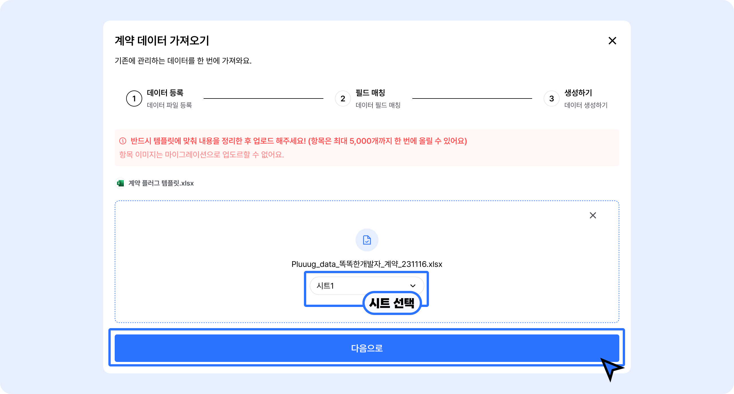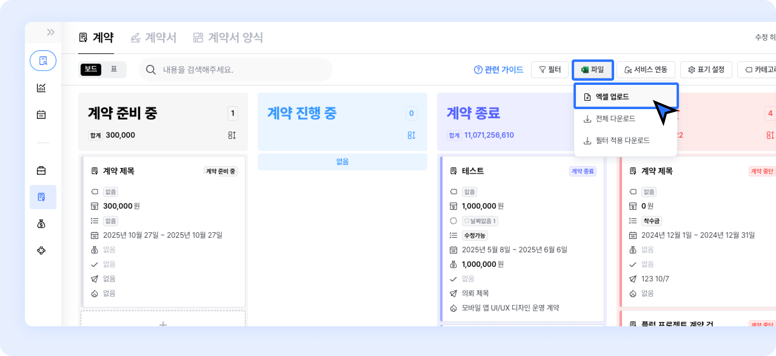 계약페이지 우측 상단파일 > 엑셀 업로드버튼을 클릭하세요.계약 플러그 템플릿.xlsx 파일을