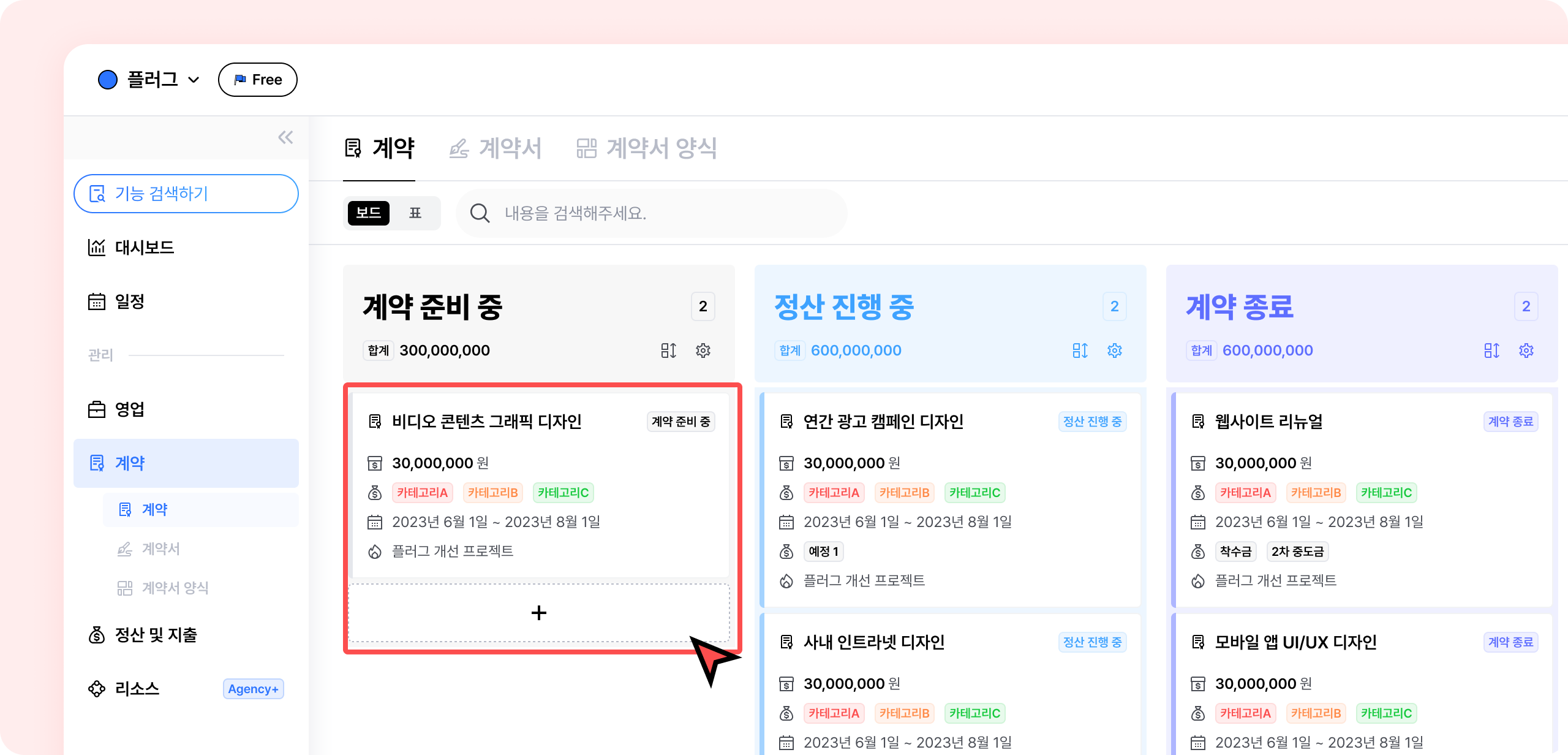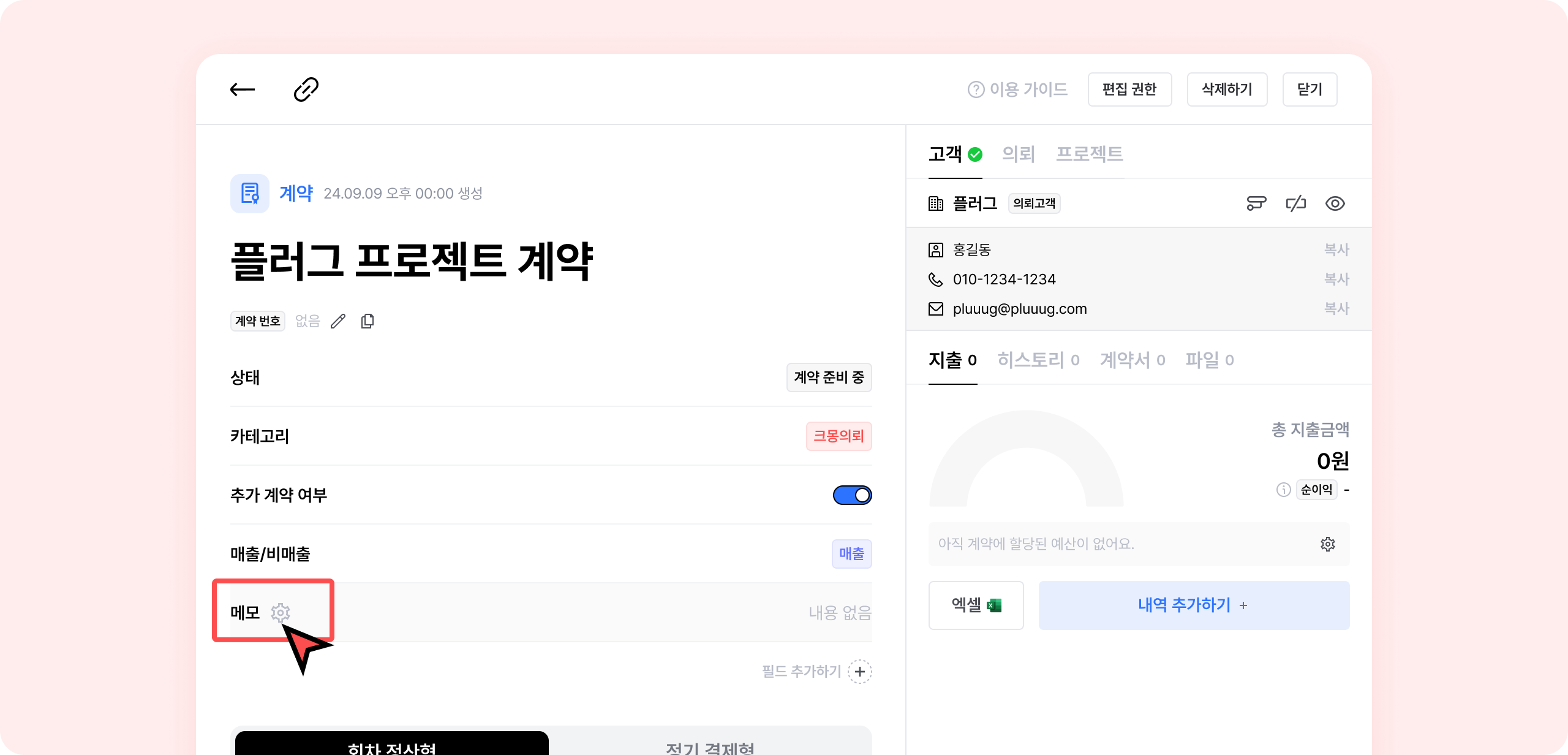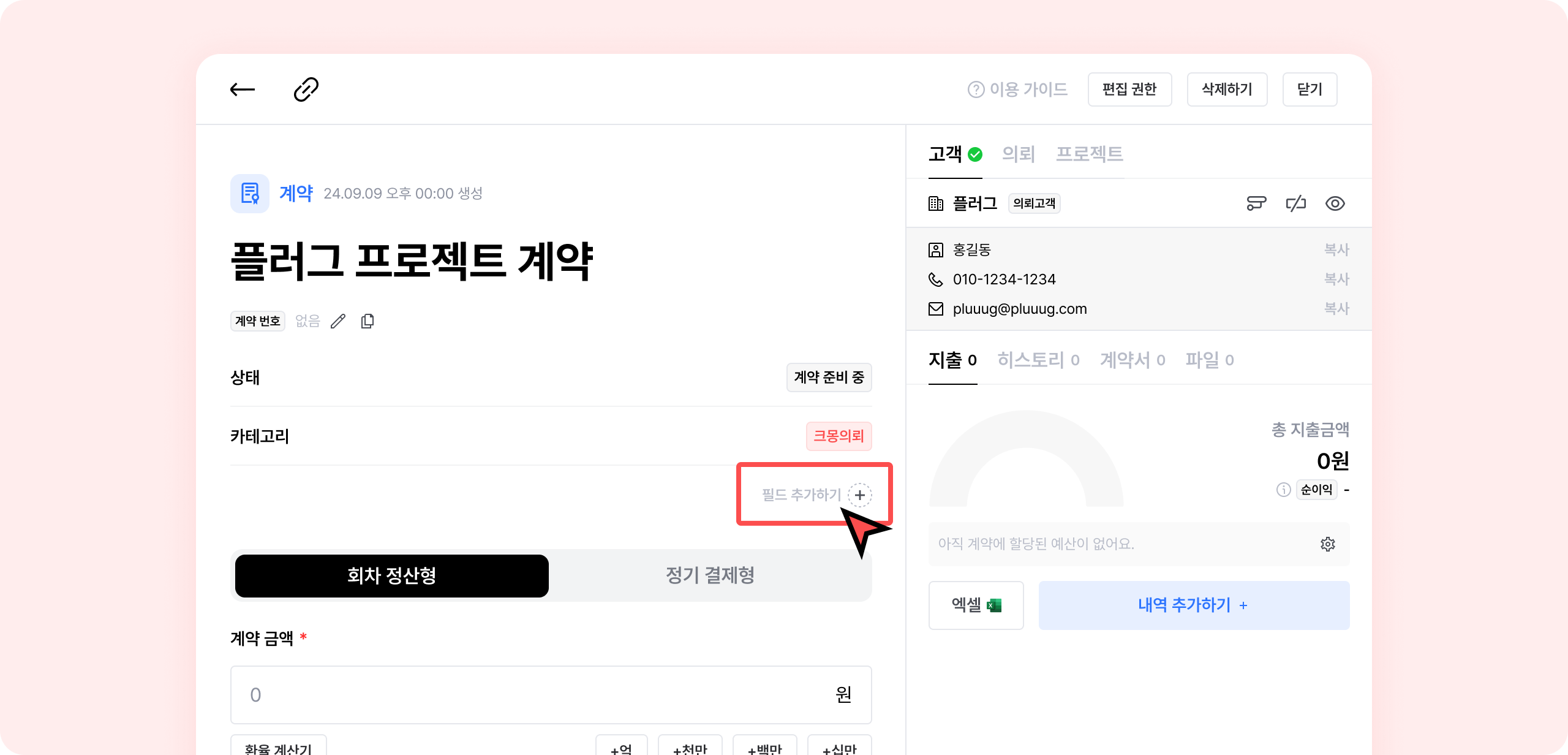 계약 메뉴>계약 리스트를 클릭하거나, 추가해주세요.기본 필드 하단