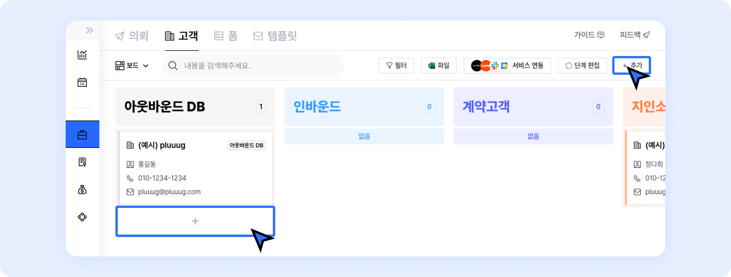 세일즈 > 고객 페이지에서 우측 상단 + 추가 버튼 또는 리스트 하단 + 버튼을 클릭하세요.