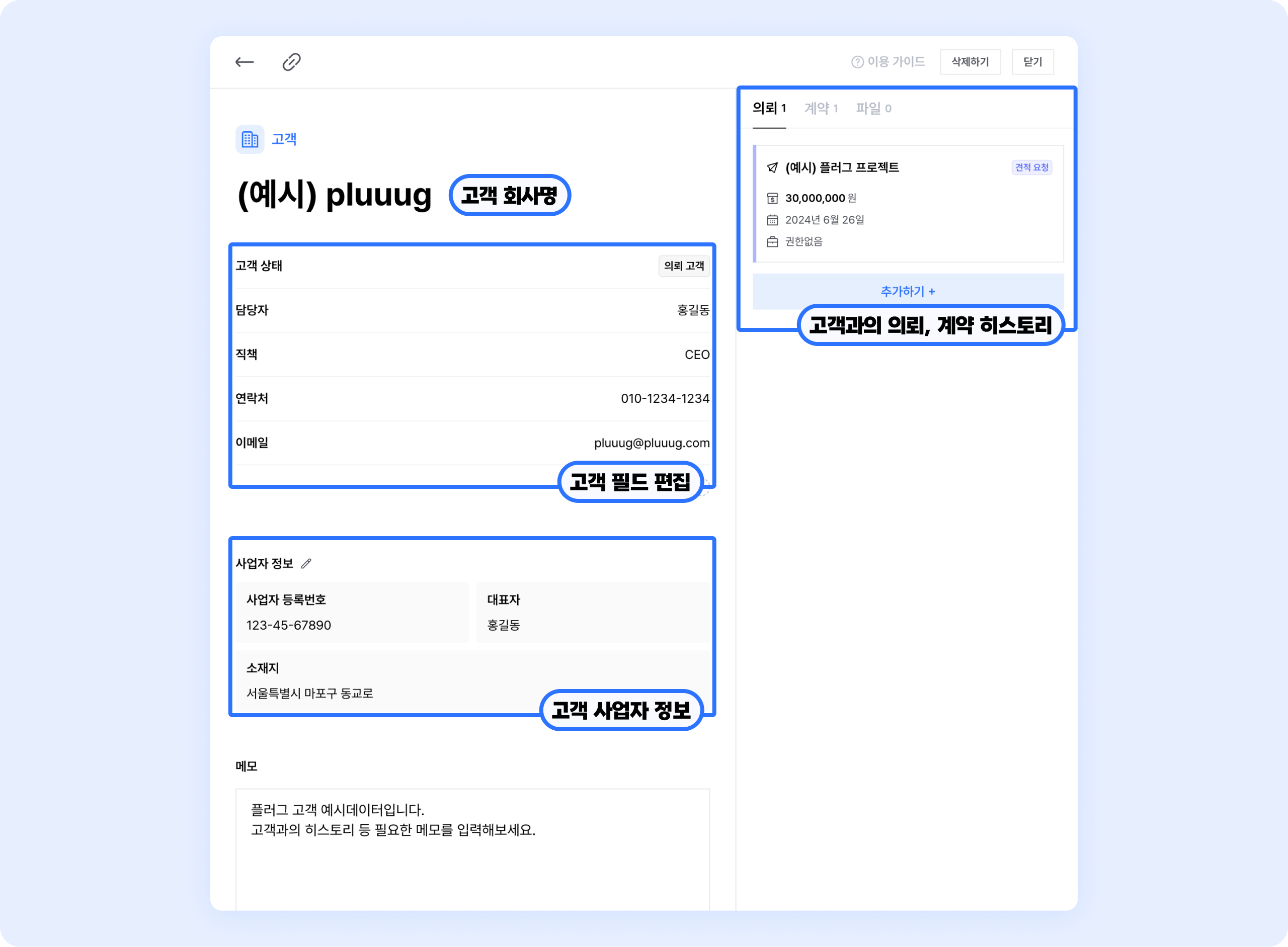 고객을 생성하고, 고객의 정보와 더불어 함께한 의뢰, 계약 히스토리를 연결하고 관리할 수 있어요.