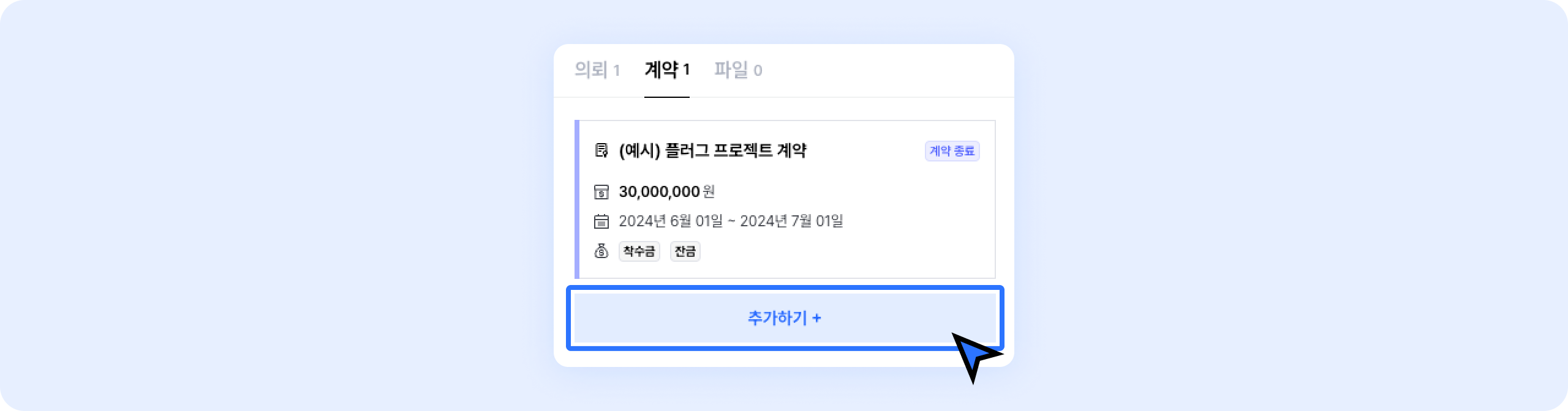 고객 화면 우측 계약 탭에있는 추가하기 + 버튼을 클릭하세요.