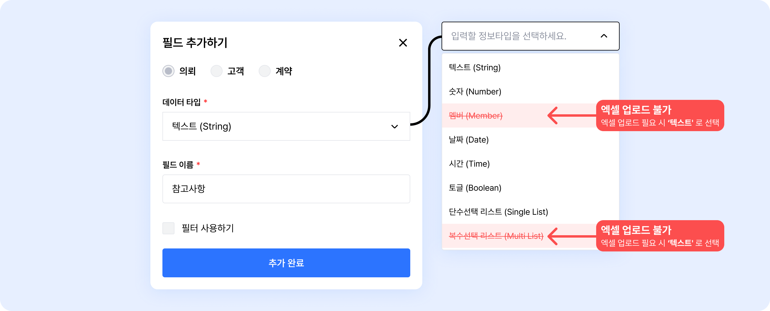 복수선택이 가능한 데이터 타입(멤버, 복수선택)은 엑셀 업로드 시 매칭이 불가능해요.