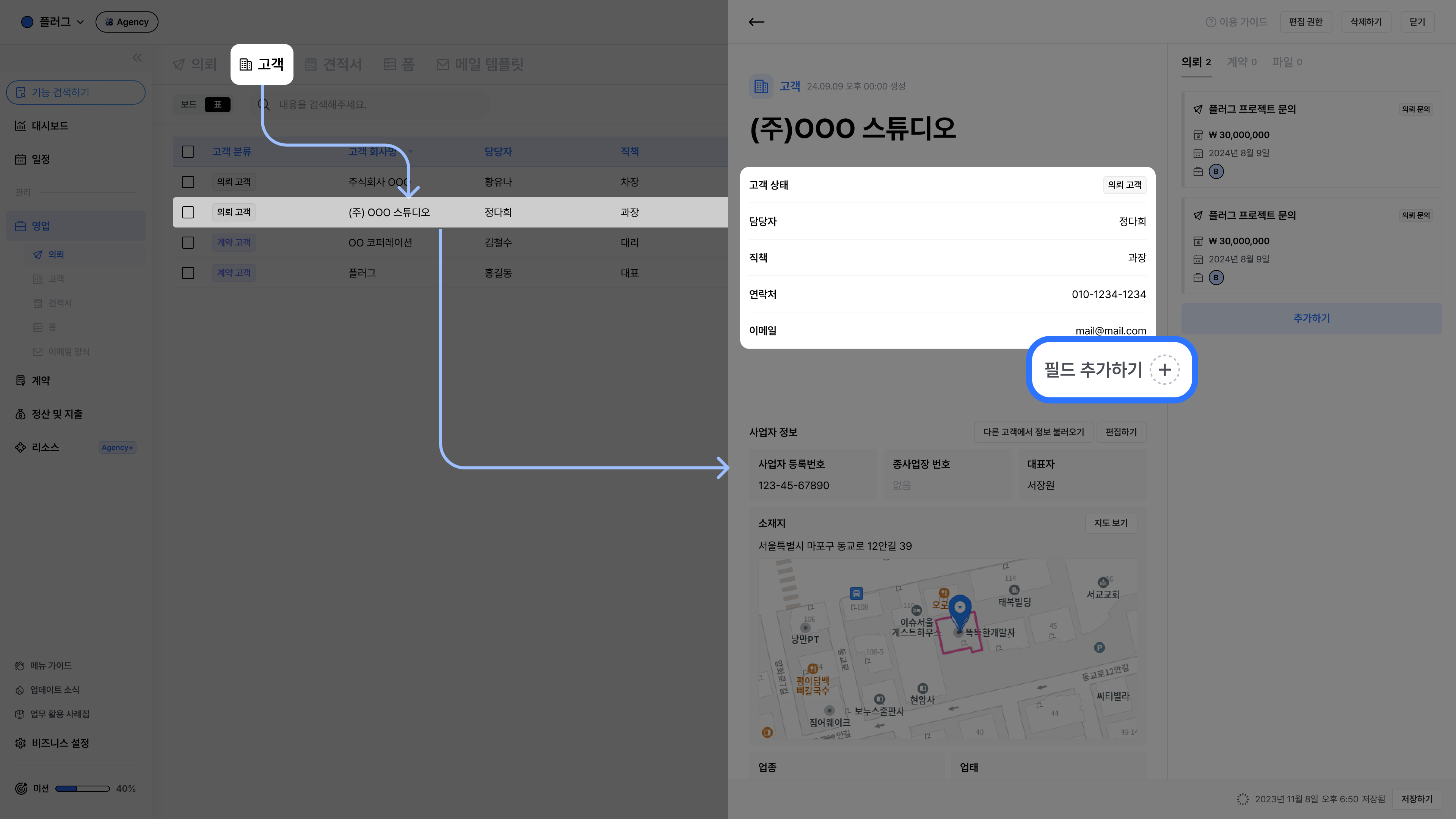 고객 페이지에서필드 추가하기+버튼을 클릭하세요.데이터 타입과필드 이름을 입력한 후,추가 완료를 클릭하세요.