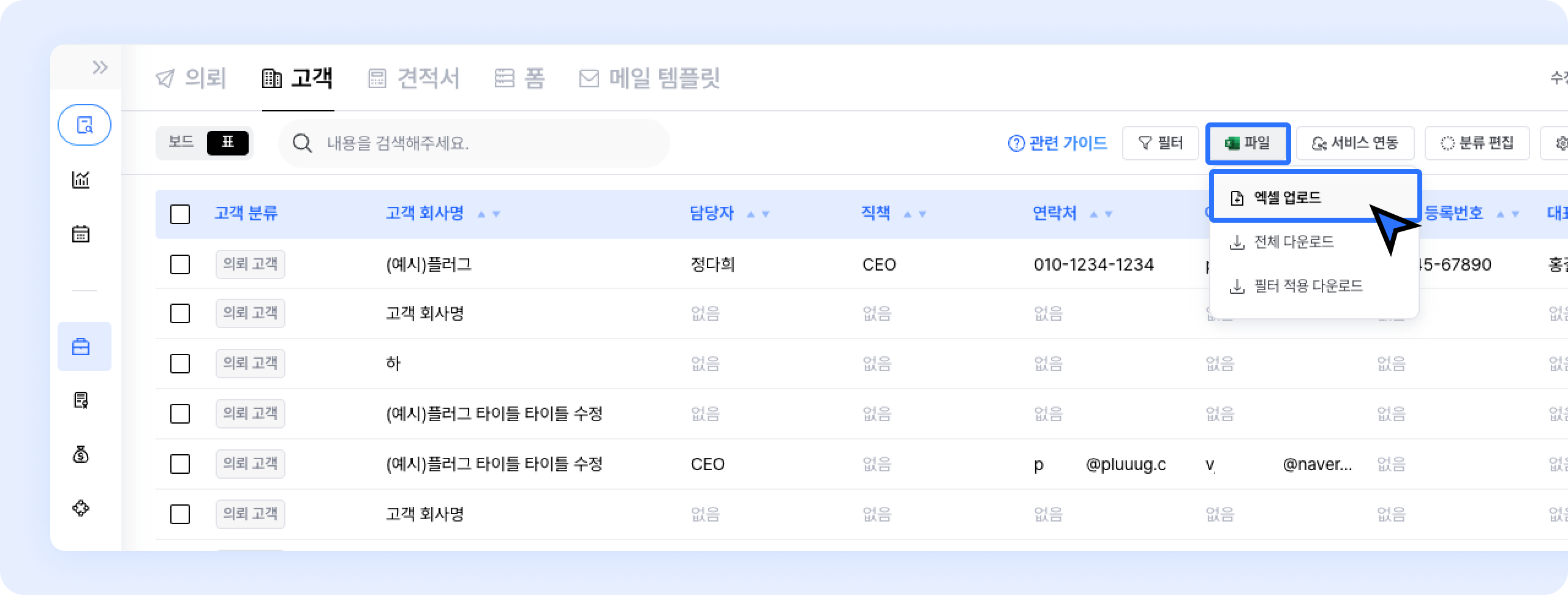 고객페이지 우측 상단파일 > 엑셀 업로드버튼을 클릭하세요.고객 플러그 템플릿.xlsx 파일을