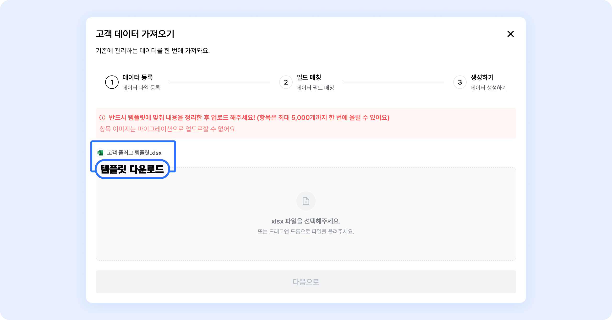 고객 데이터를 한 번에 업로드할 수 있어요. 업로드할 고객 필드를 설정해주세요.