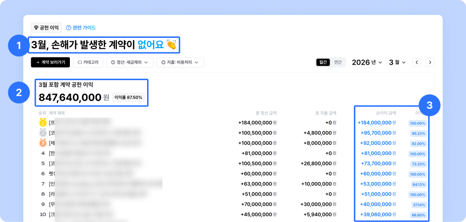 ③ 현재 보고 있는 월에 포함된 모든 계약 별 최종 순이익과 이익률을 확인할 수 있어요.