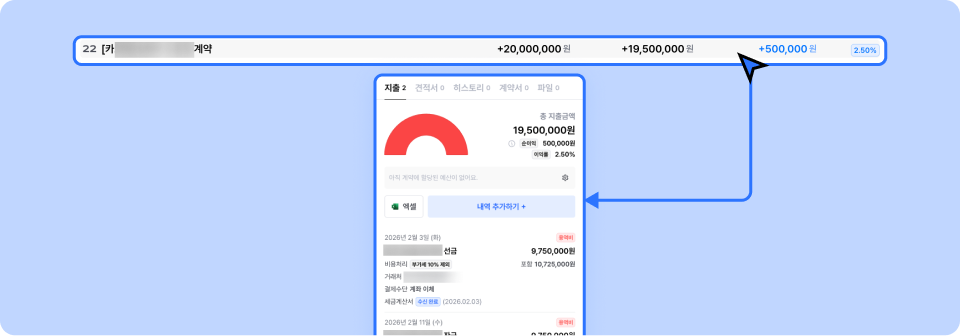 계약의 '총 정산 금액'과 '총 지출 금액'을 기반으로 손익을 파악할 수 있어요. 각 월 안에서 포함된 모든 계약의 손익 현황을 한눈에 파악할 수 있어요. 계약 내에서 재하청, 원재료비, 마케팅비 등의 지출이 자주 발생해 계약 별 순이익을 관리해야하는 회사에 추천해요.