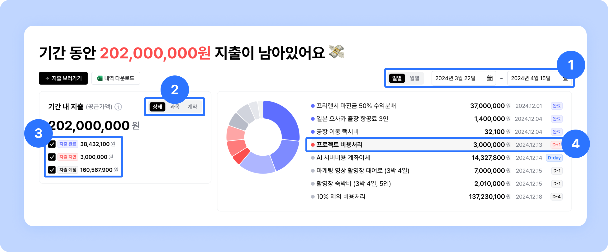 ② 기간 내 지출은 상태별 / 과목별 / 계약별로 금액을 집계해서 확인할 수 있어요.