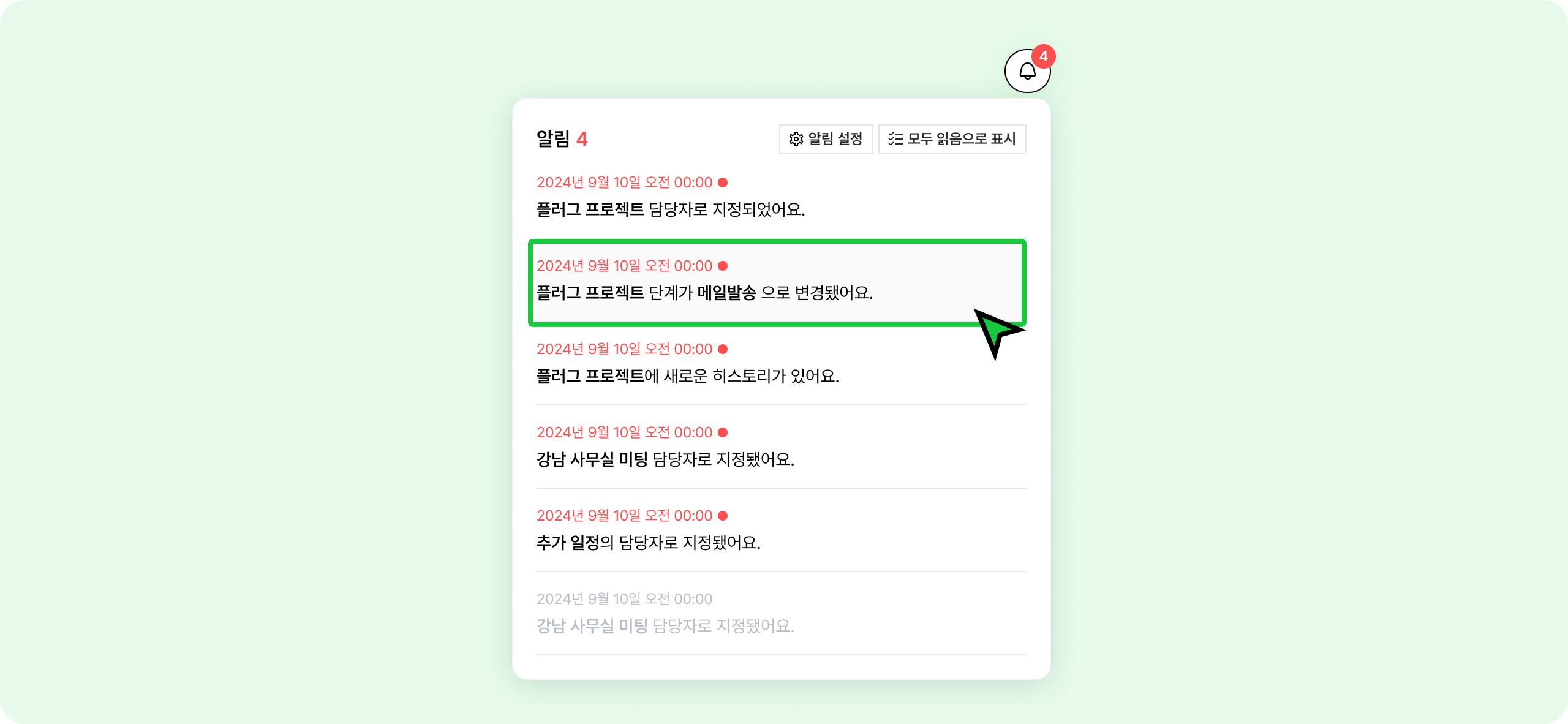 아직 확인하지 않은 알림은 빨간 색으로 표시돼요.