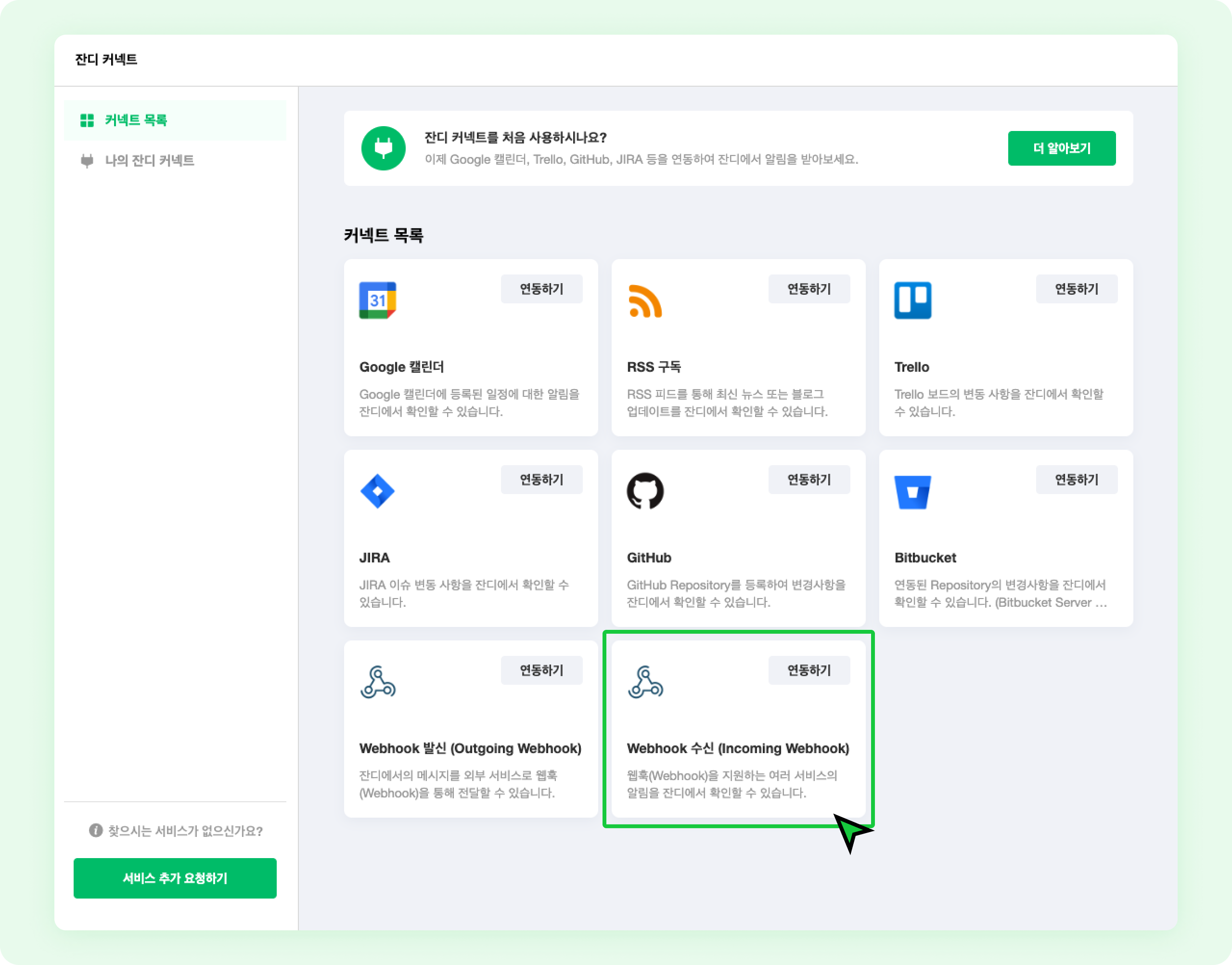 Webhook 수신 (Incoming Webhook) 연동하기를 클릭하세요.